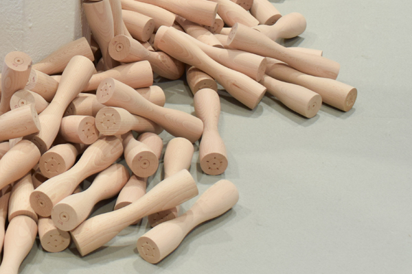 71 Bastidores de DM entelados con loneta cruda de algodón y tablex, 7 perchas o escuadras de madera sapelly y 7 rastreles de madera sapelly. Dimensiones variables