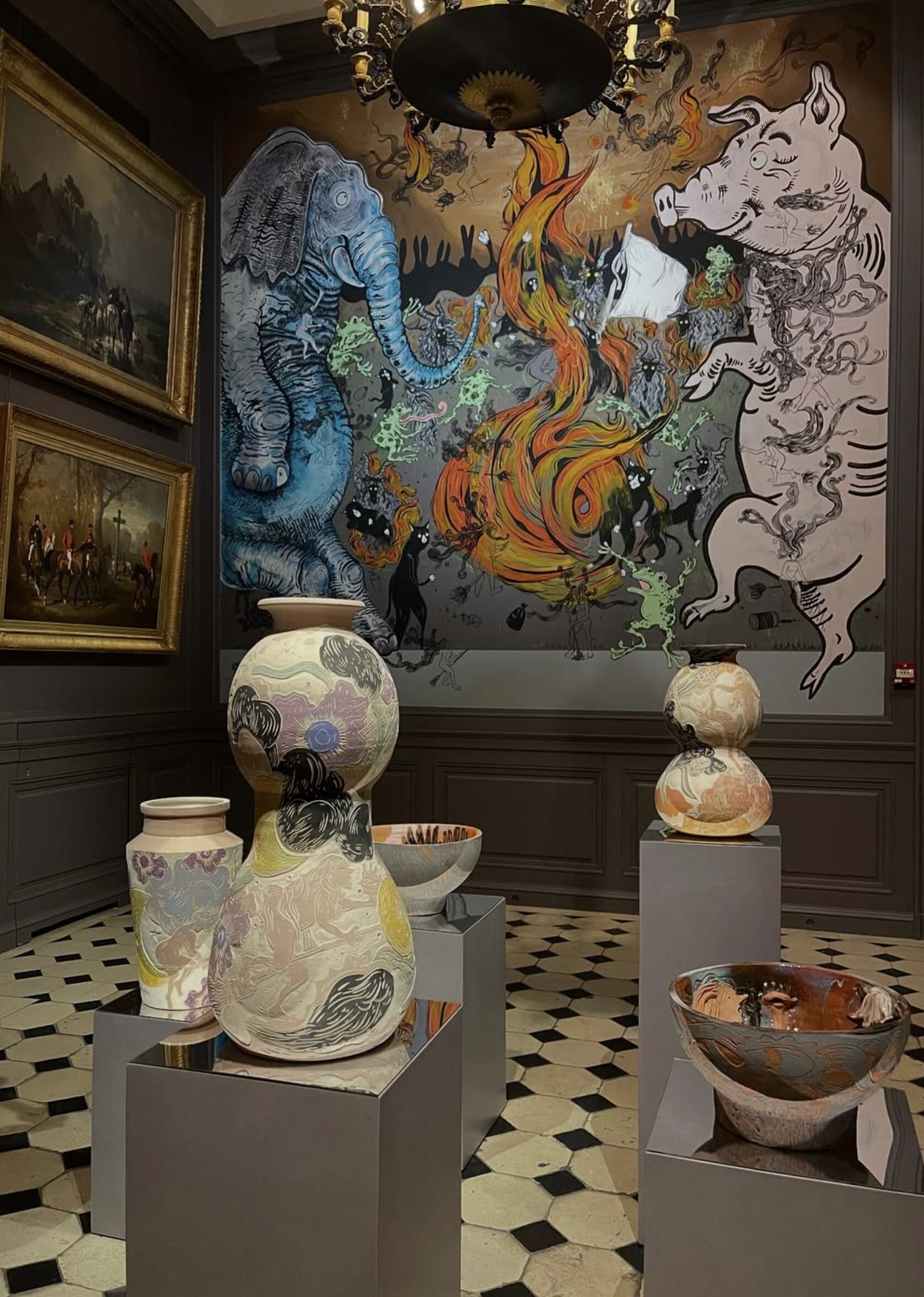 Alexandre Lamarche and Florentine Ovize is a French artist duo who have been working together since 2006. Their artistic practice explicitly refers to the Arts & Crafts movement, as an attitude in which they materialise thought in objects, giving rise to a wide variety of hybrid forms. Similarly, their corpus consists of a multiplicity of media, from tapestry patterns and ceramics, to video animations, drawings and installations. This shift from one medium to another maintains a cause-and-effect relationship, in which motifs are shot eccentrically and abundantly across walls, sketches and notes.