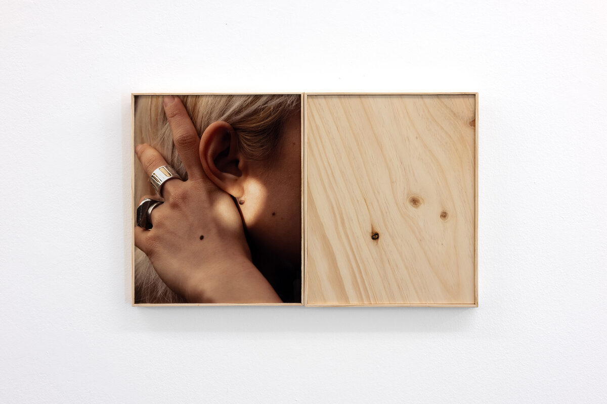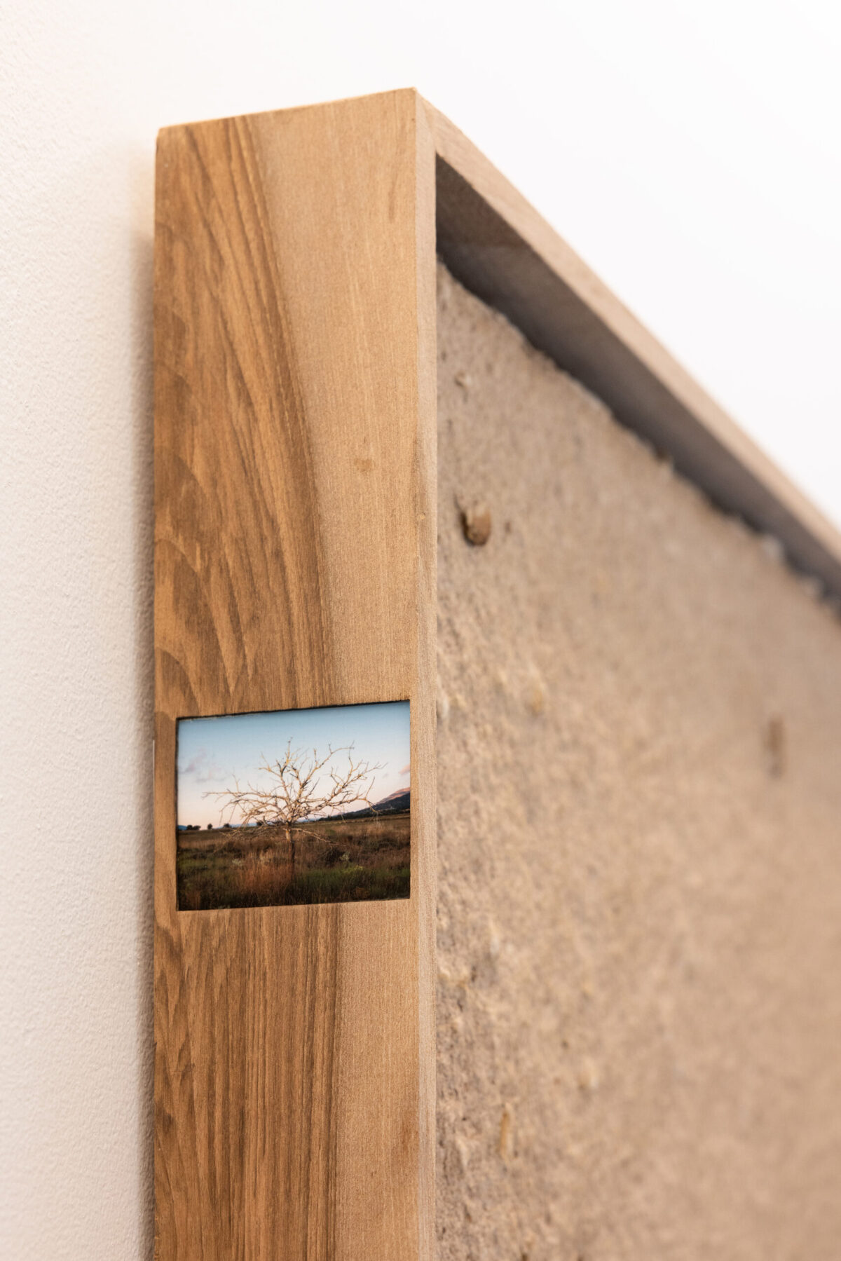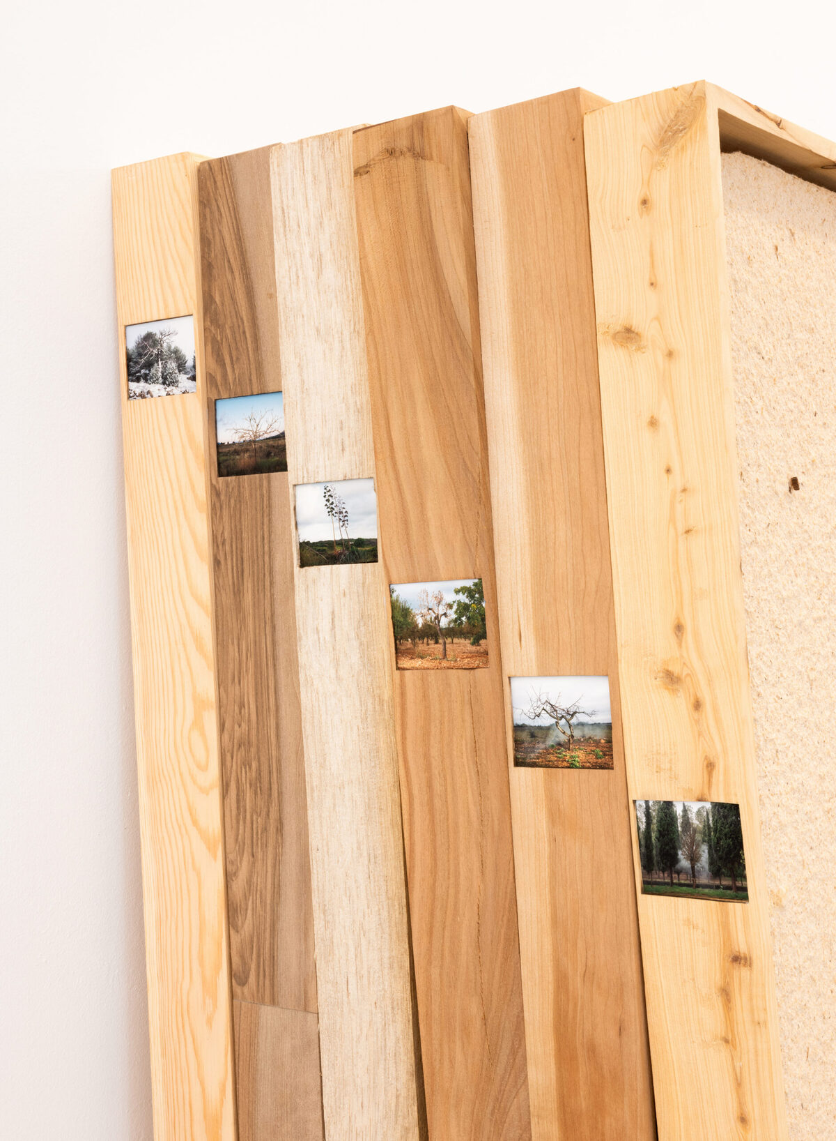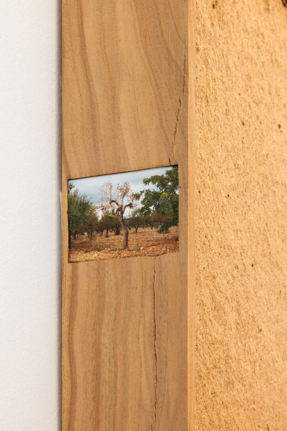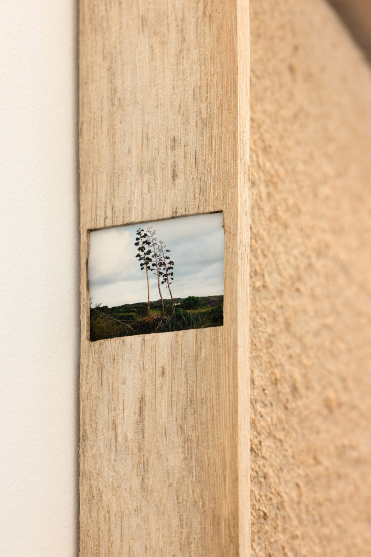 and the soft, keratin and cellulose, orality and flesh. Palau uses sculpture to reflect on the proximity between patterns in nature. This recontextualization of the link between nature and knowledge also connects with testimonies of healing that some people have shared with the artist, which are materialized in some pieces. She also works with trees, an element that in Palau’s rural community has been treated as a subject and witness to the link between generations. The artist has created a repository of local species, which she translates into a series of papers in the gallery, framed with wood from the trees to which they refer. She has also been involved in practices aimed at caring for trees, such as pruning. These reveal the fragility