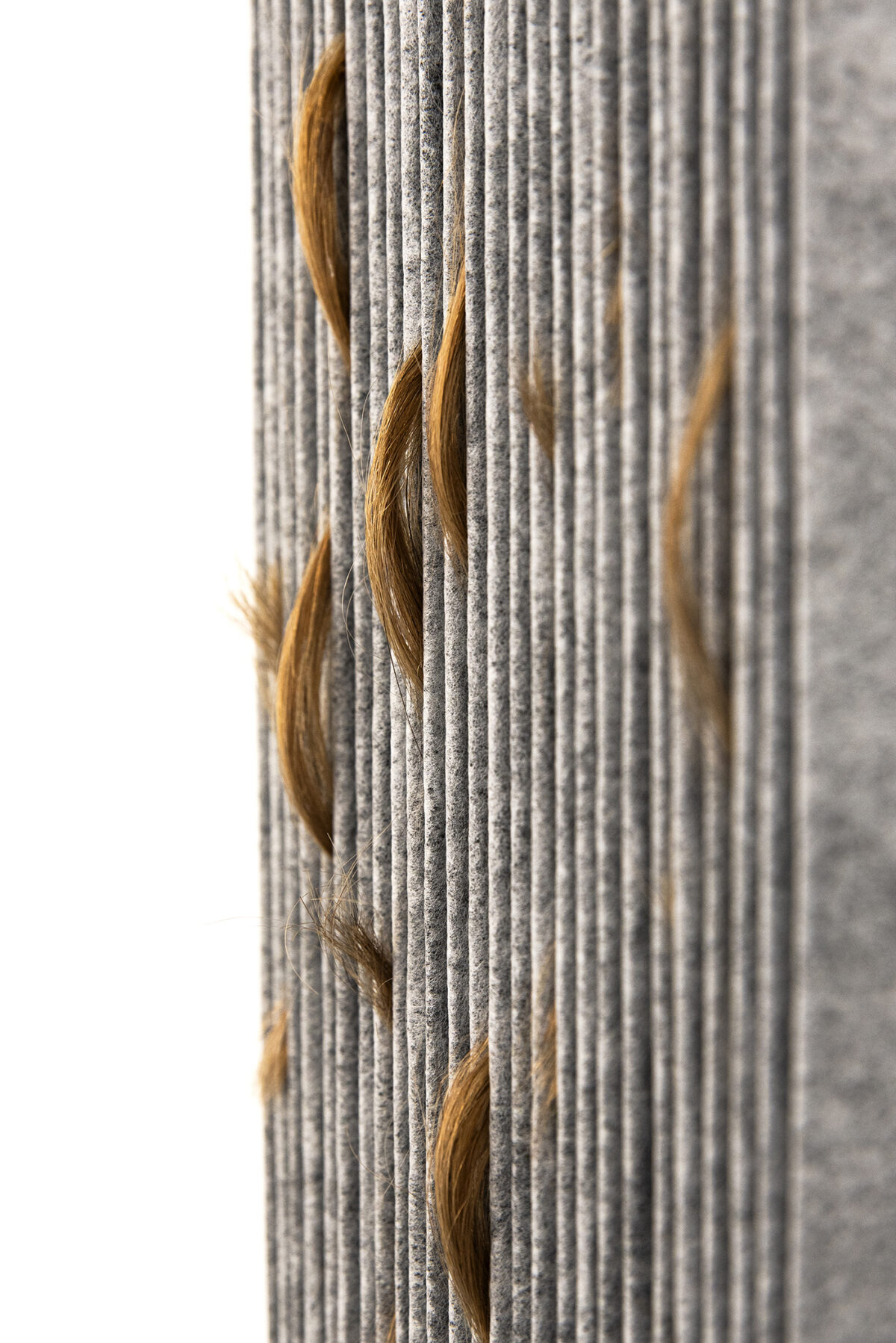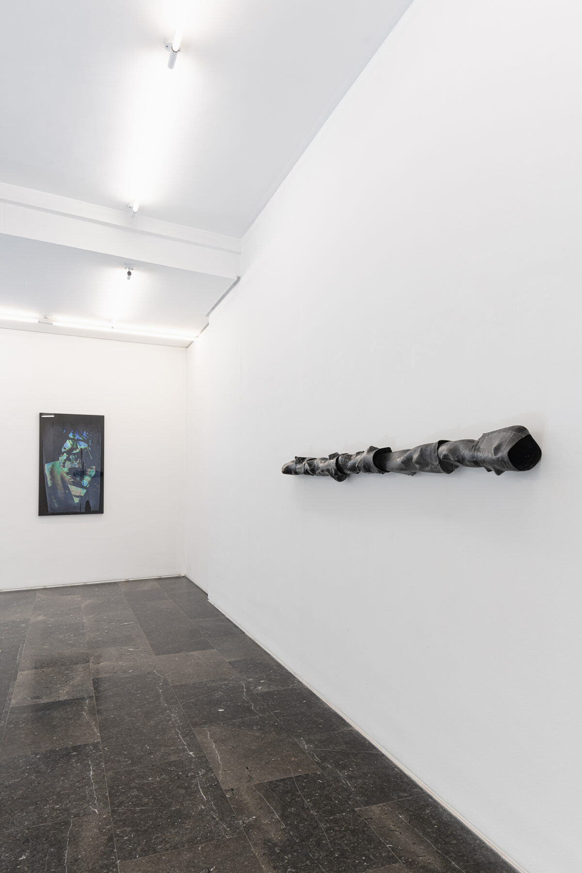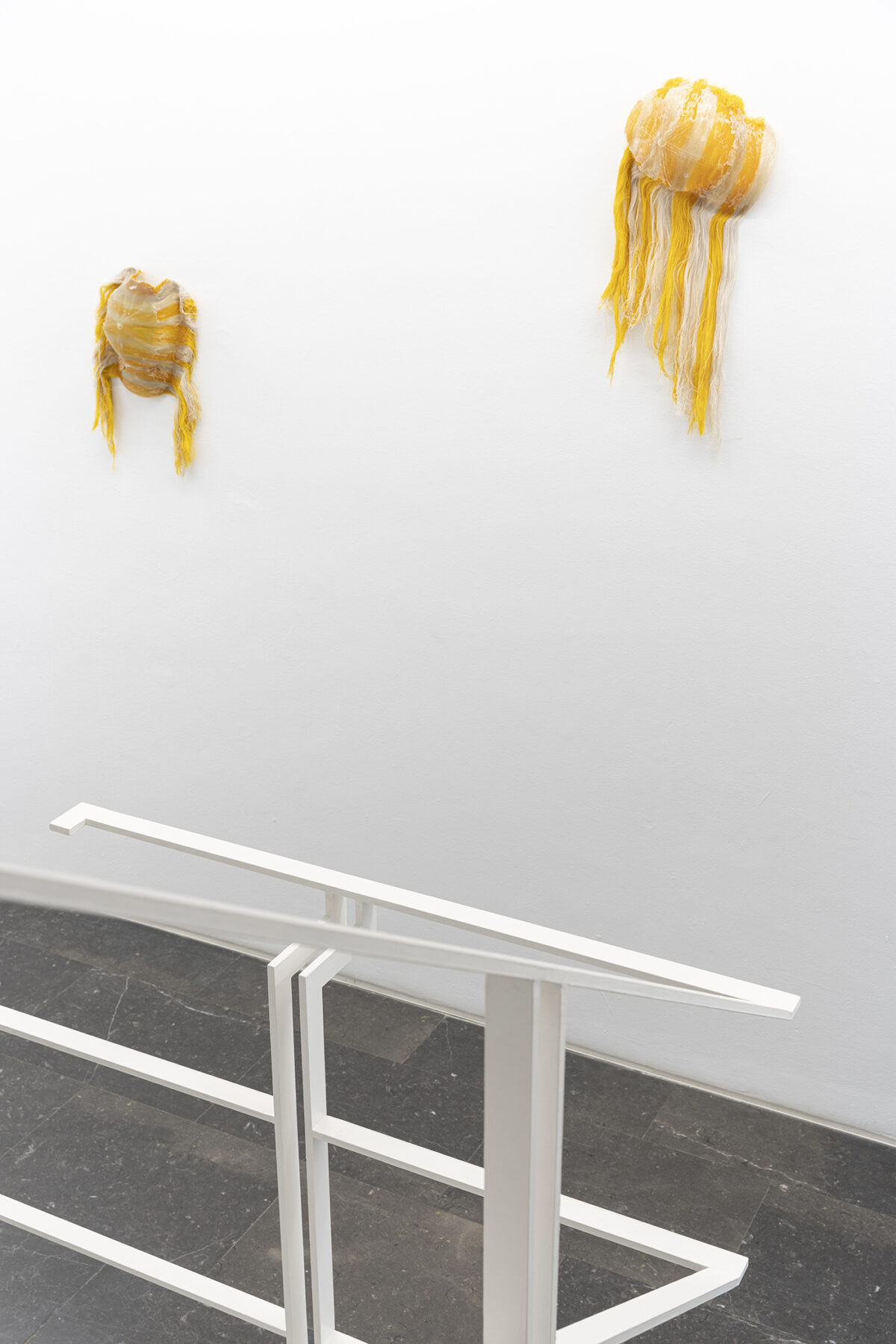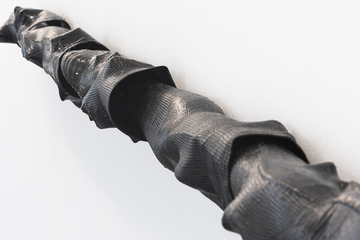 M Reme Silvestre exhibits objects and materials that operate disturbingly as a kind of trace left by couplings, contacts and rubbings of contemporary bodies and prosthesis. Untitled (railing) is comprised of arm-covers made from technical material solidified with resin that refer to body parts through their absence, a metaphor of the body as recipient. The small pieces with filters with hair also engage with the remains of the vulnerable body, controlled and subjected by the demands of production of today’s system.