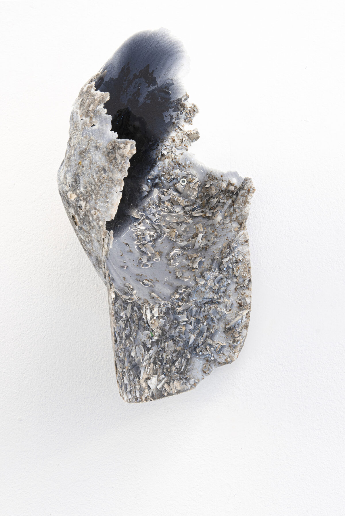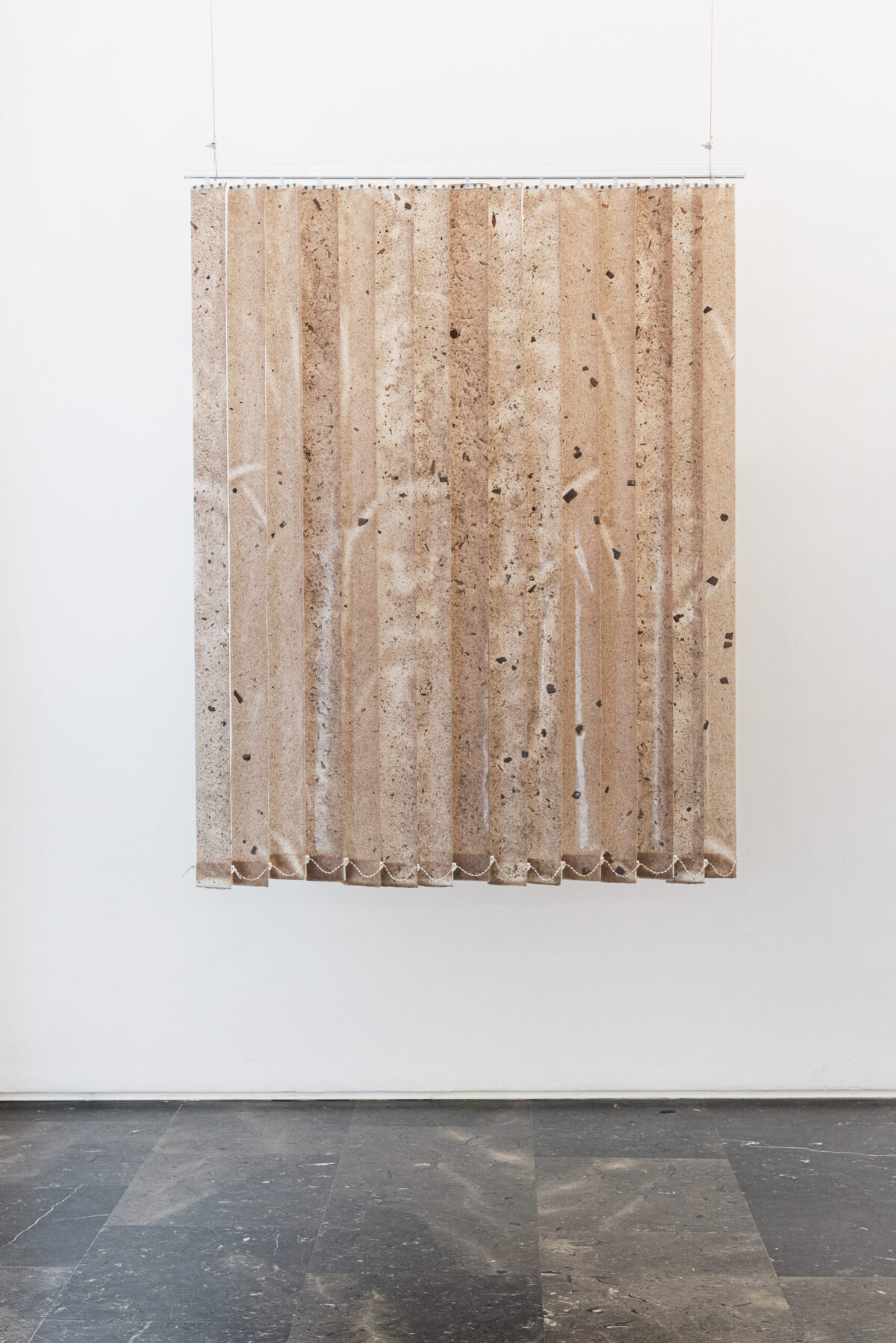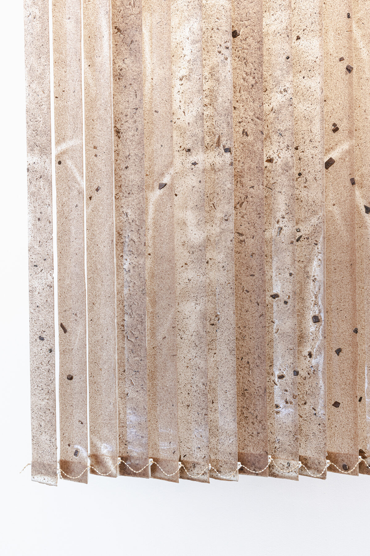 M Reme Silvestre exhibits objects and materials that operate disturbingly as a kind of trace left by couplings, contacts and rubbings of contemporary bodies and prosthesis. Untitled (railing) is comprised of arm-covers made from technical material solidified with resin that refer to body parts through their absence, a metaphor of the body as recipient. The small pieces with filters with hair also engage with the remains of the vulnerable body, controlled and subjected by the demands of production of today’s system.