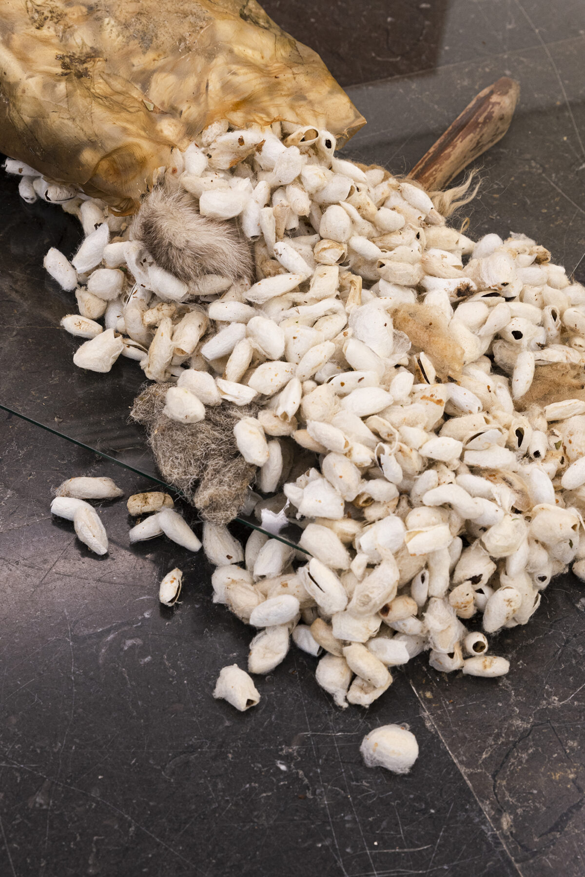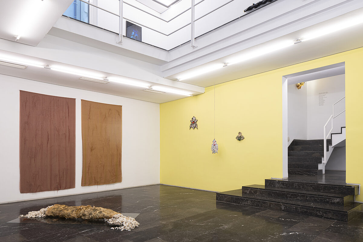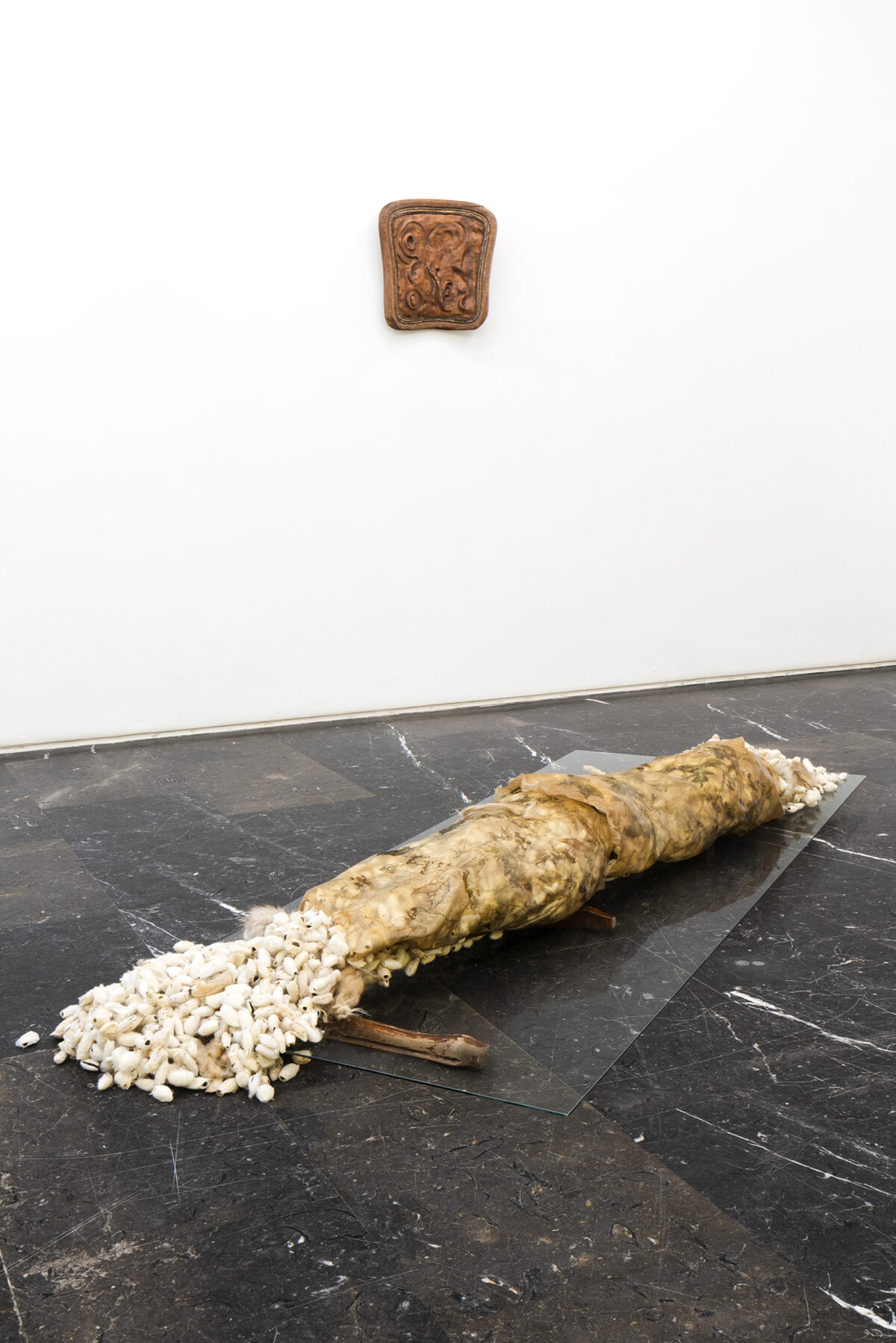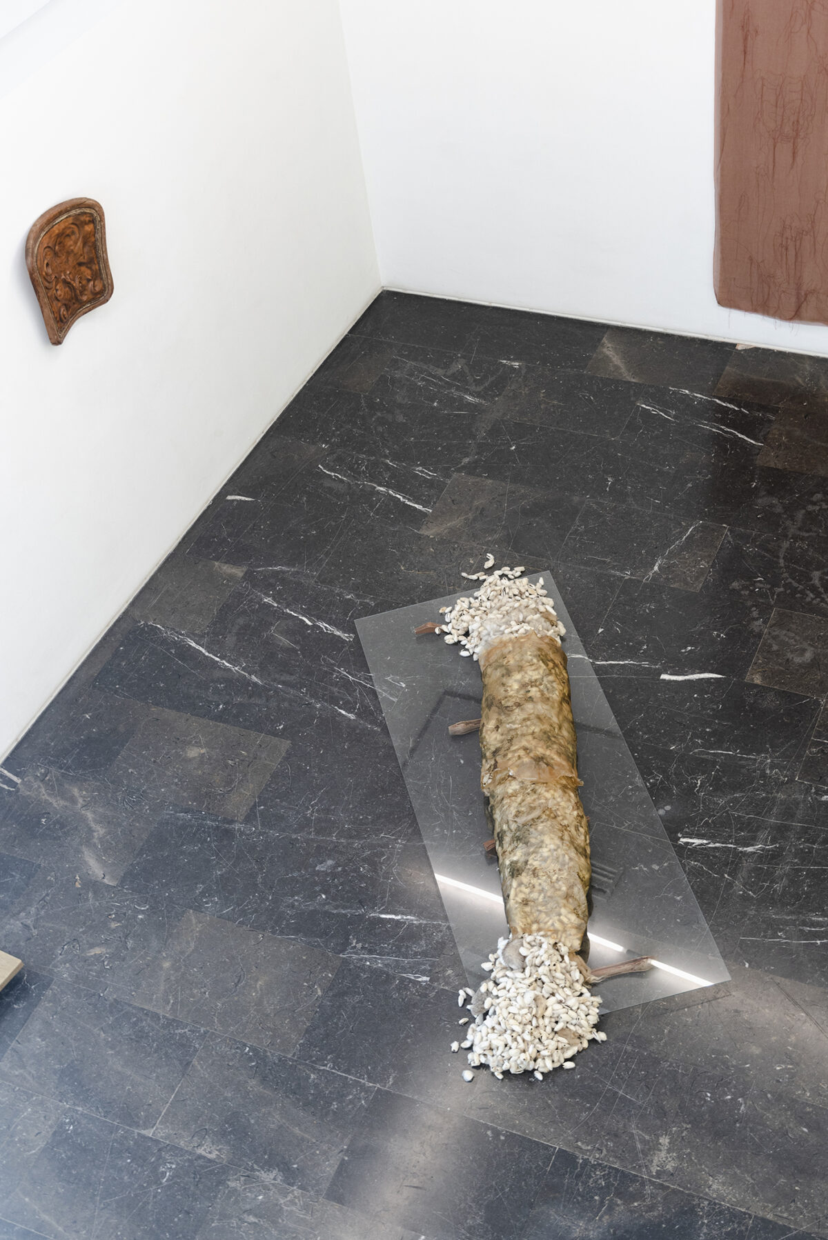 Mónica Mays presents two works called Tending Towards, which comprise two bodies stuffed with wool and silk cocoons reminiscent of beds with headboards with all kinds of deformed organic elements. In these mutable pieces that defy all classification, animal and plant elements acquire anthropomorphized domestic forms. An unbounded presence, caught between states, seemingly in a process of decadence and decomposition, understood as a fertile, porous and cross-contaminating space.