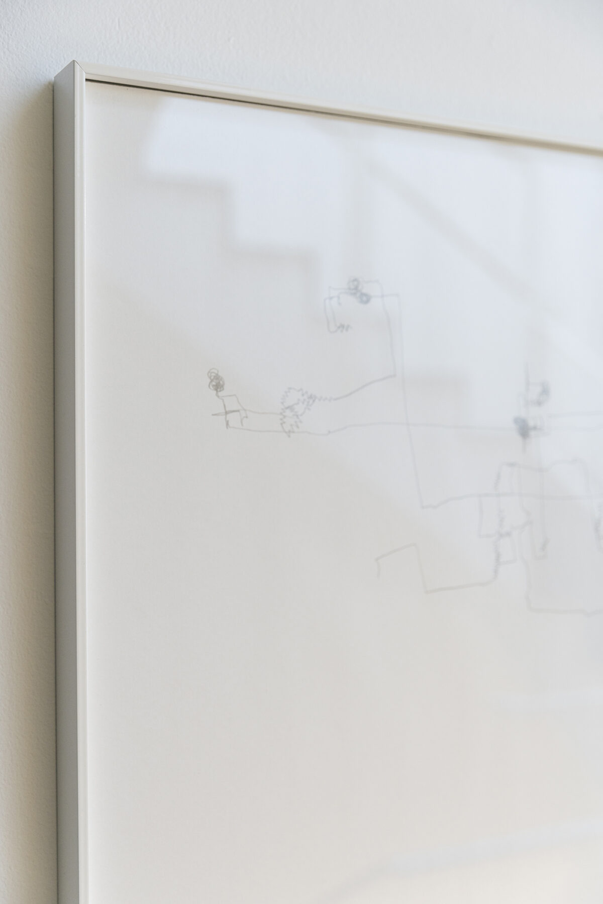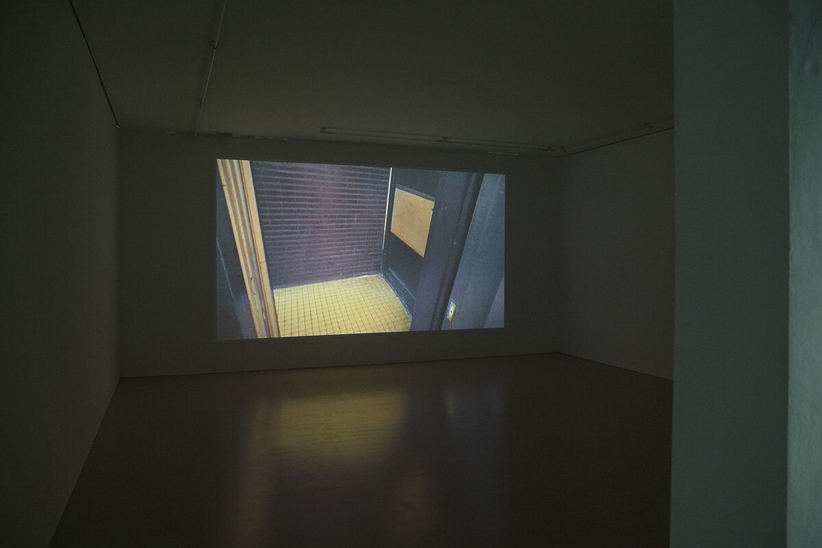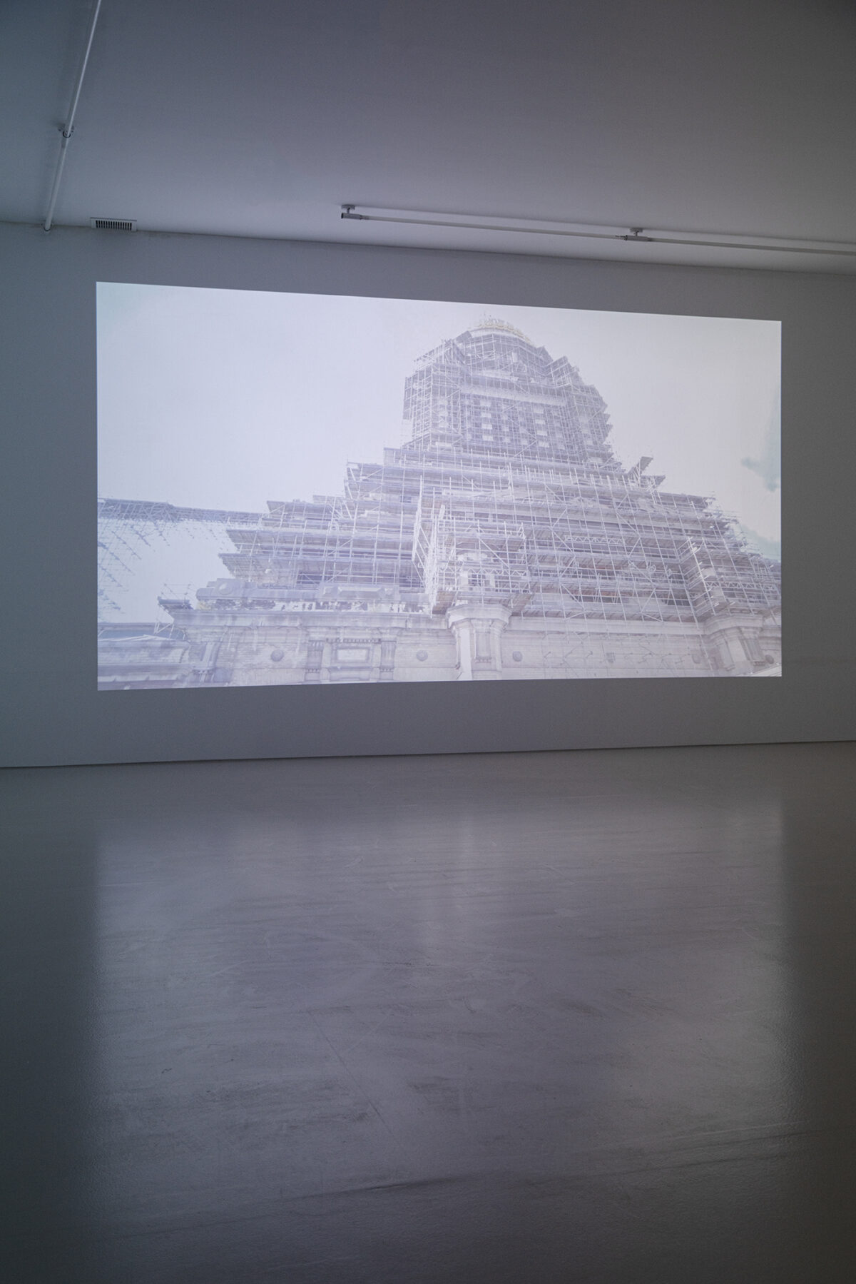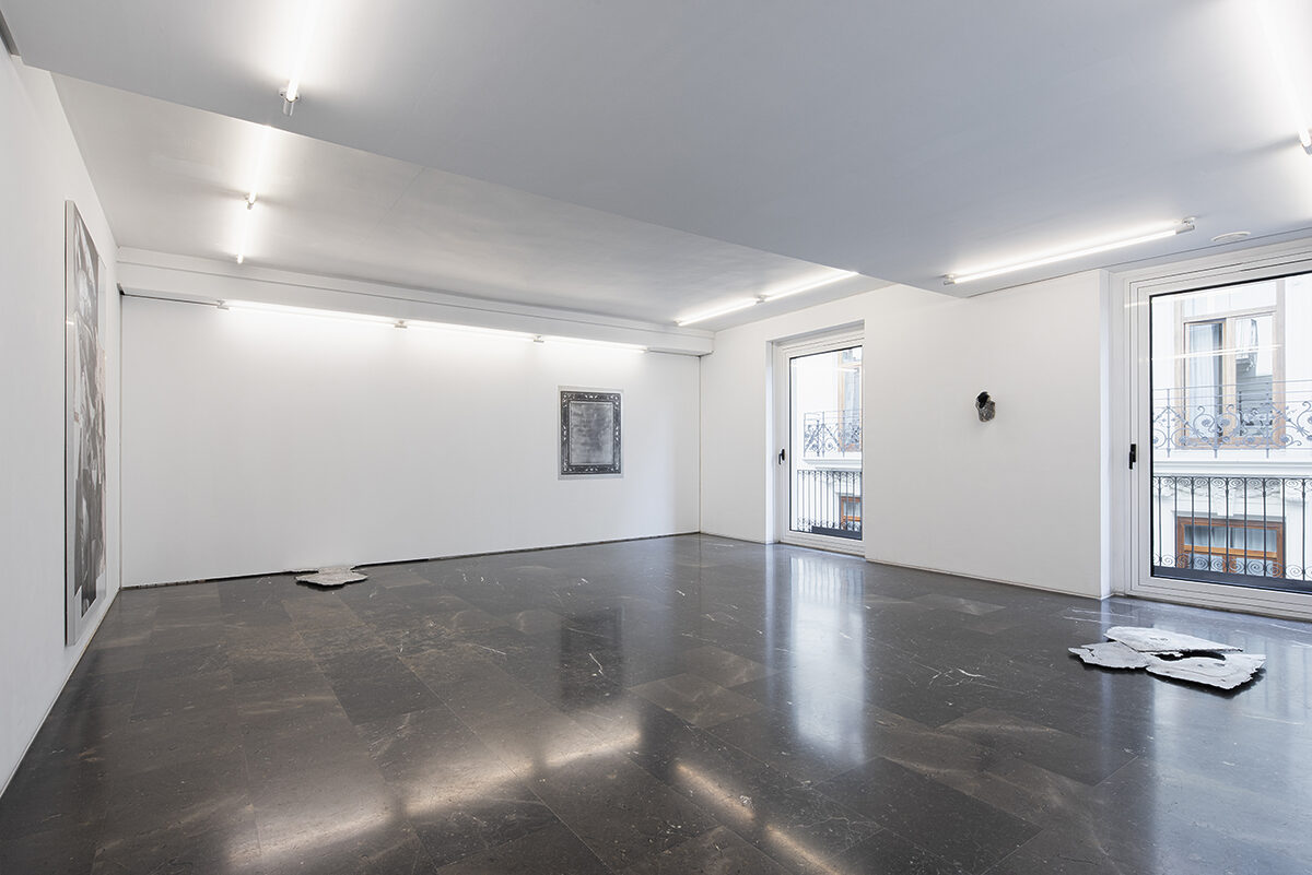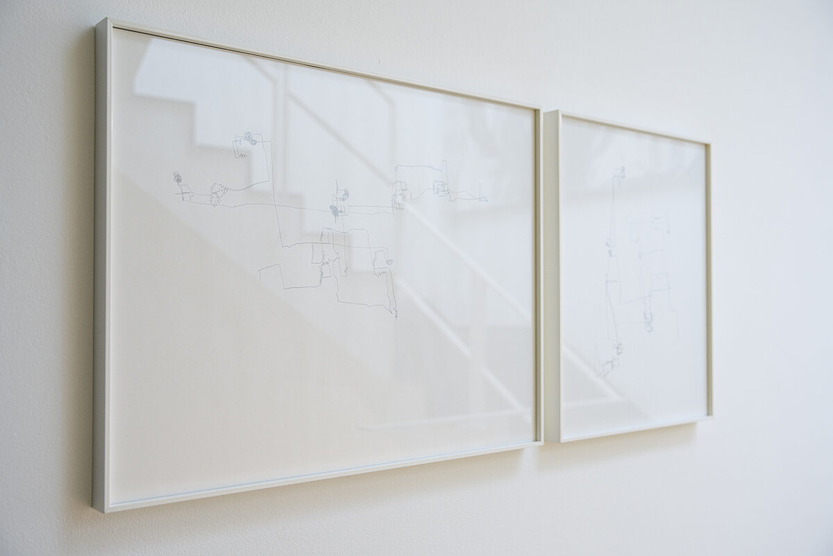 On the top floor of the gallery we can see the audiovisual piece Palais, filmed by Alex Reynolds. A body leads us on a stealthy, rushed and somewhat nervous path through the labyrinthine bureaucratic rooms of a nineteenth- century monumental building: Palace of Justice in Brussels. The intrigue unfolds in a game proposed by the artist, altering the conventions of storytelling and our reception, challenging our structures of perception, stimulating the curiosity of the spectator, who must project and finish the work. The installation is coupled with a diptych of pencil drawings rendering part of the path in two dimensions.