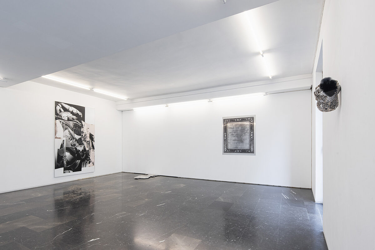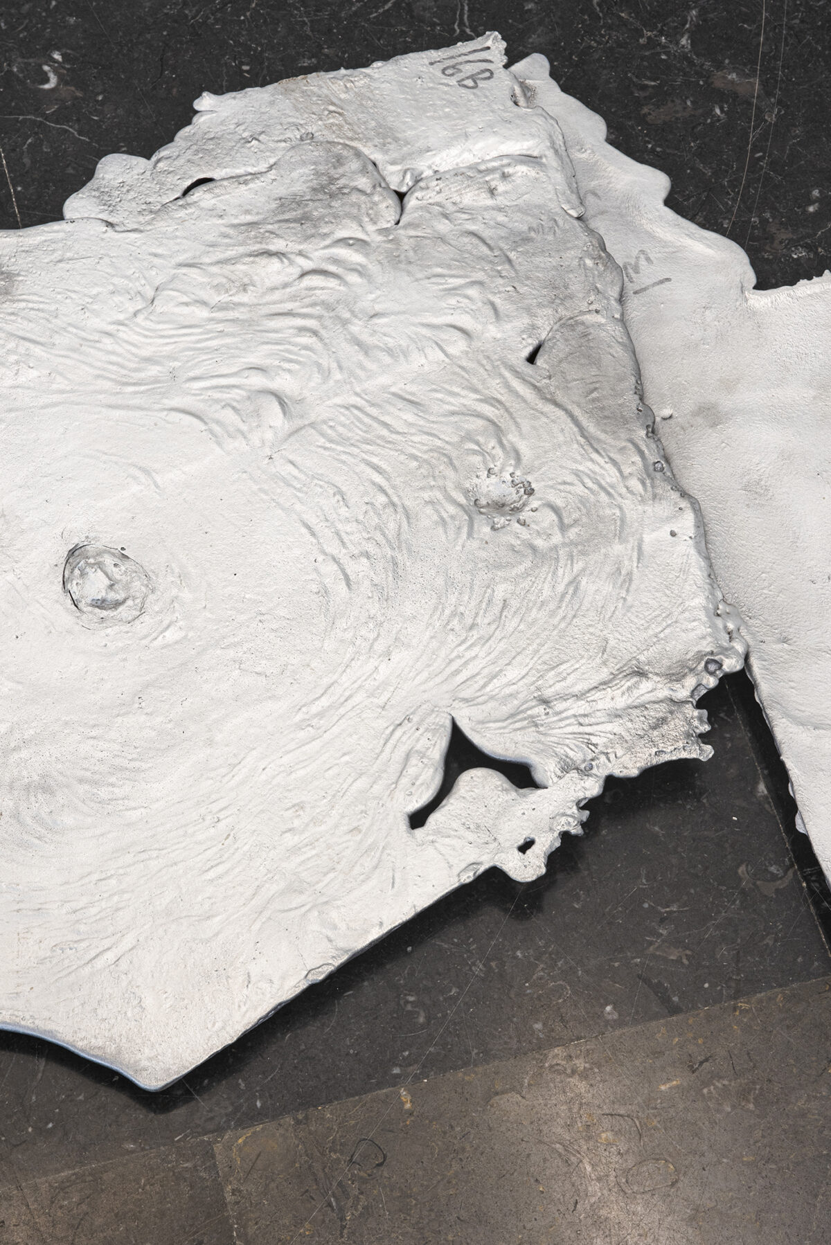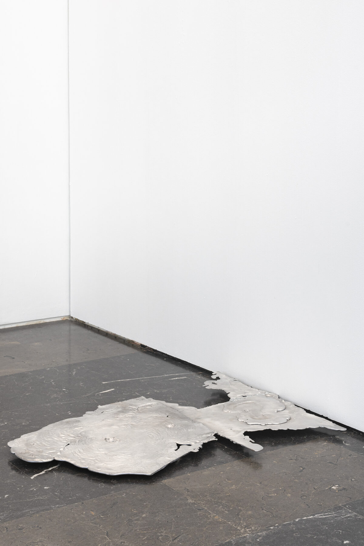Victor Santamarina presents a floor installation made by coupling various puddles of aluminium that have been formed by discharges, leaks, tides and multidirectional flows. They are the product of an intuitive and sensorial exploration in which the artist establishes a peculiar negotiation between his body and the materials. The work is unfolded in its full potential through the material and its poetic use, revealing a quality that is more spatial than object-based, at once producing a wide spectrum of reflections responding to the ambient light.