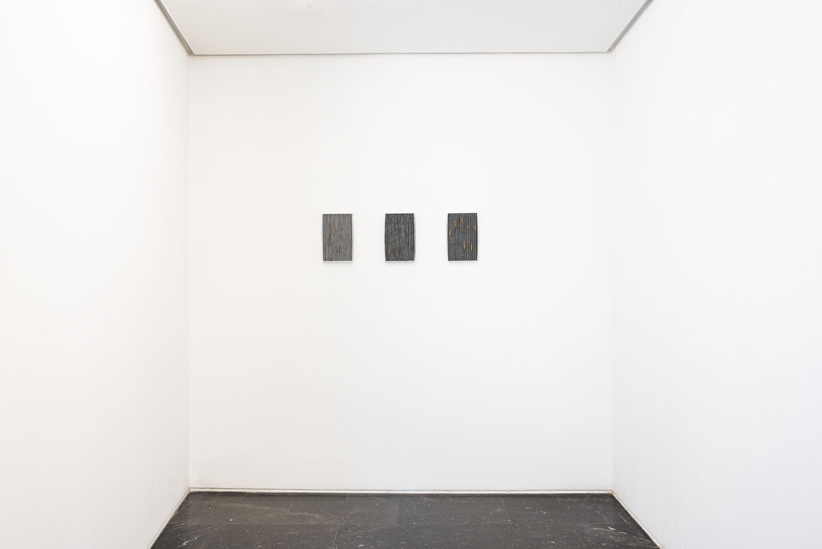 Mercedes Azpilicueta presents two large textile works embroidered with two-tone natural silk and linen, on which the artist has sewn stitches as