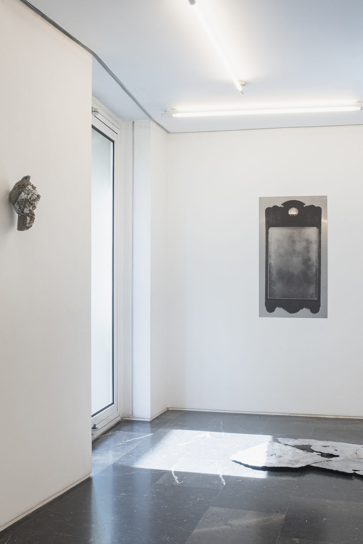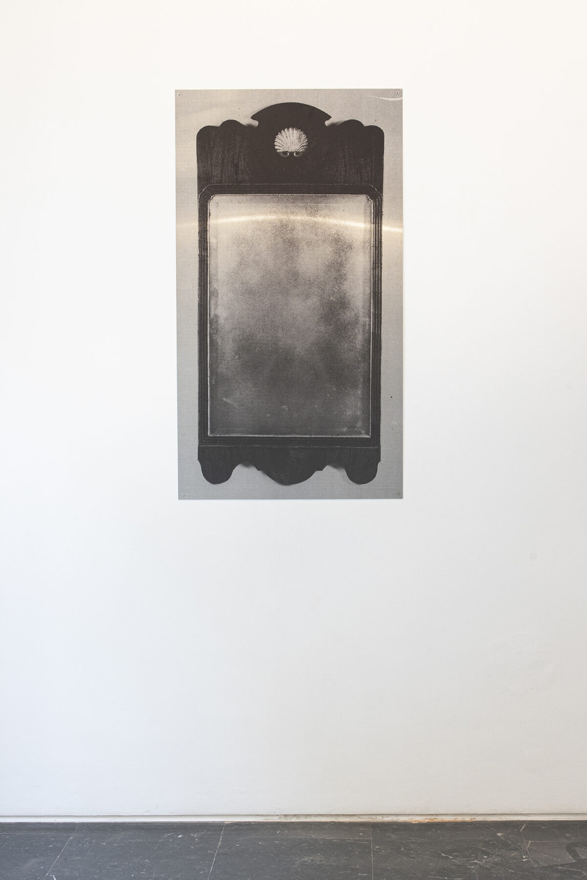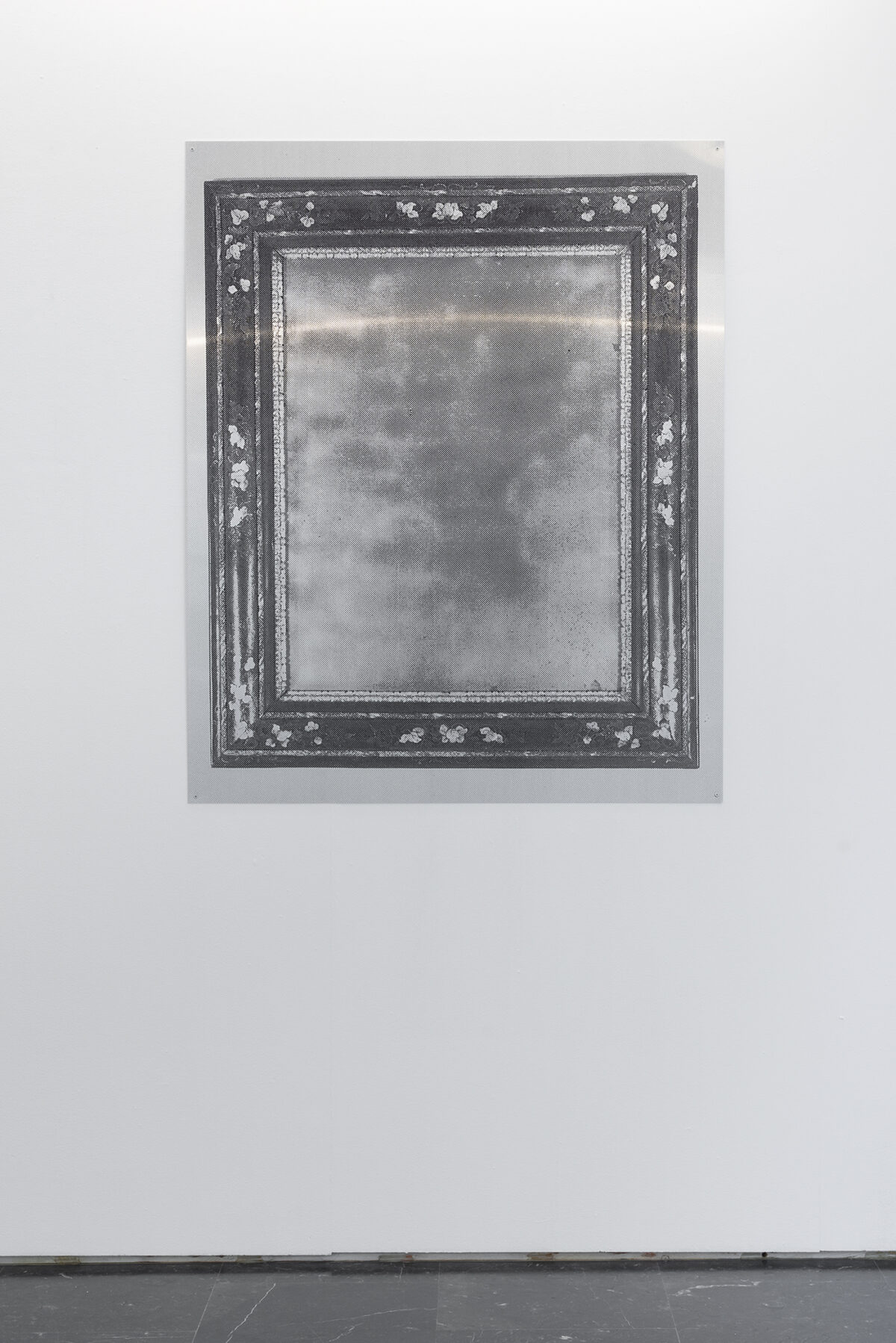 Yann Sérandour presents four UV prints on polished aluminium, simulating mirrors with differing frames, but the lack of reflection creates a sense of frustration in our engagement with them. The mirror, beyond its everyday function, encloses manifold intrigues. Associated with the moon and with water, it has often been viewed as a medium between the visible and the invisible world; a recurrent object in fairy tales and legends, it is related with superstition, magic and fortune-telling, revealing the truth or a portent of back luck. Building a narrative could be a form of filling in gaps, giving meaning to a set of events whose documentary sources have been forgotten.