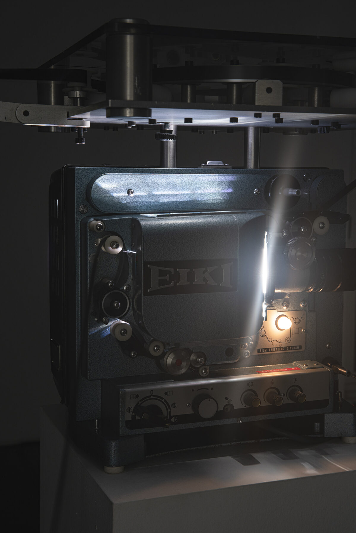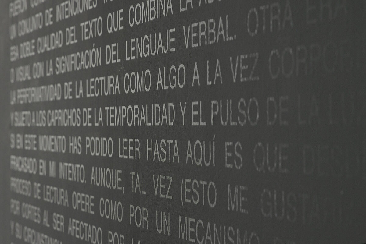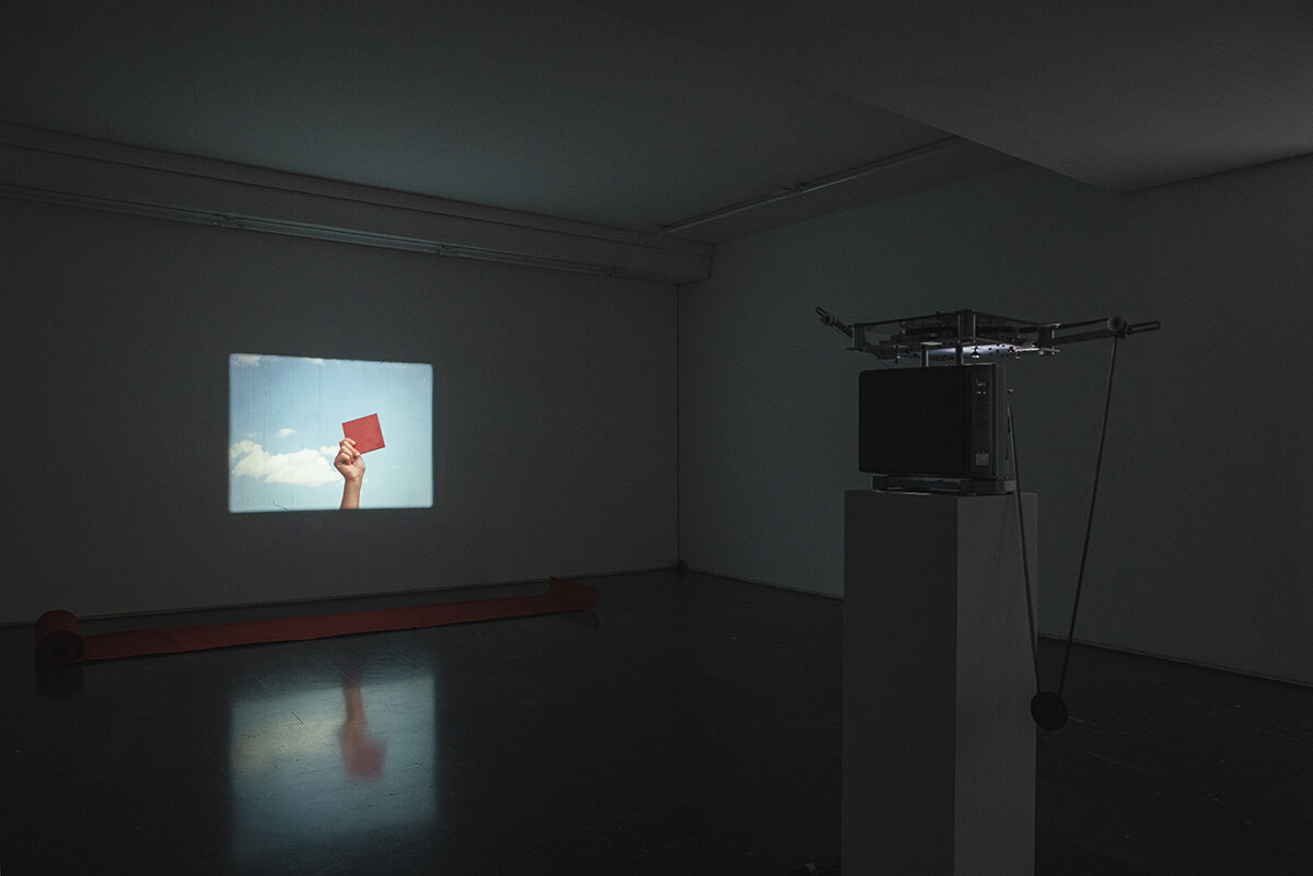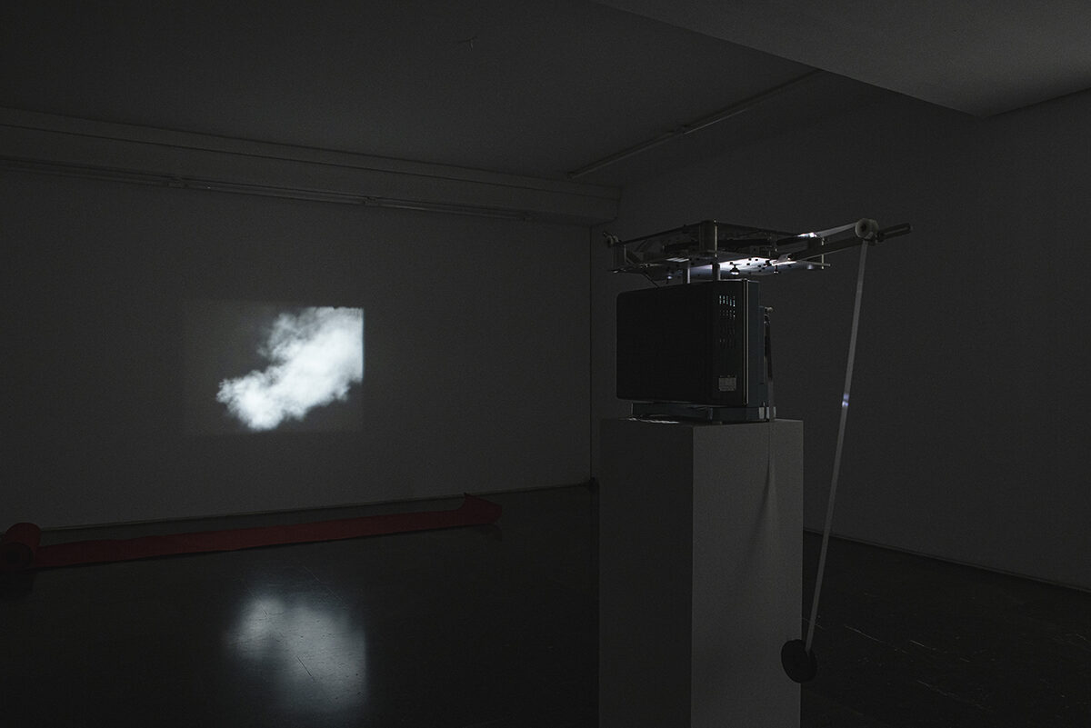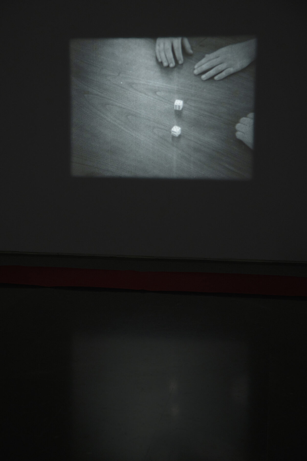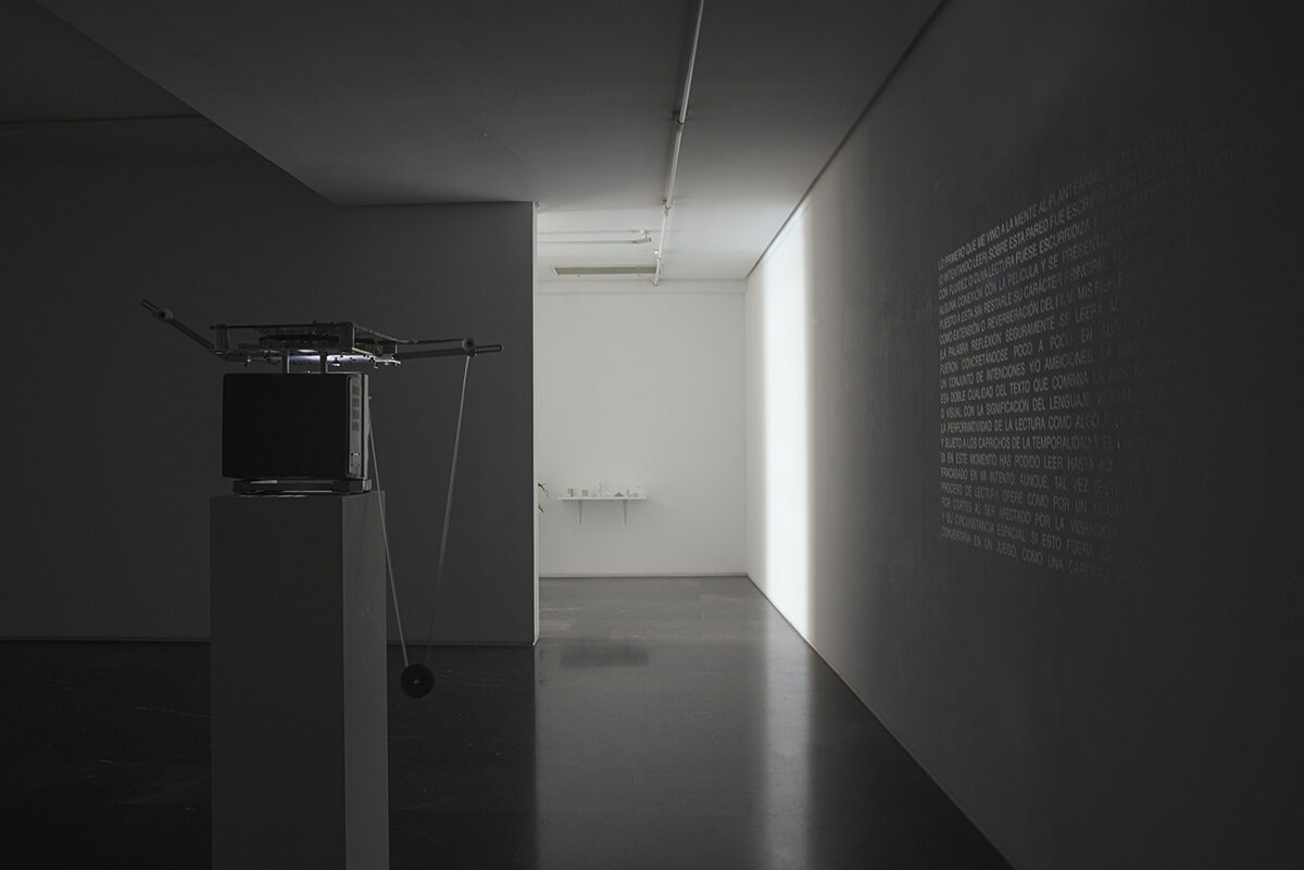 On view in the third room is Loose Ends, a film by the artist-researcher Esperanza Collado. A projector screens a series of juxtaposed images and recurrent objects that call to mind surrealist film. The rhythm is paused, the discursive structure eschews linearity and the dreamlike atmosphere keeps us in a state of illusion. The projection is coupled with a series of elements redolent of issues the artist has been exploring over recent years: the performativity of language and writing, the phenomenological aspects of the medium, the spatial, sculptural, political, social and choreographic potentialities of film at the end of the era of cinema, or the dematerialization of the medium in art practices today.
