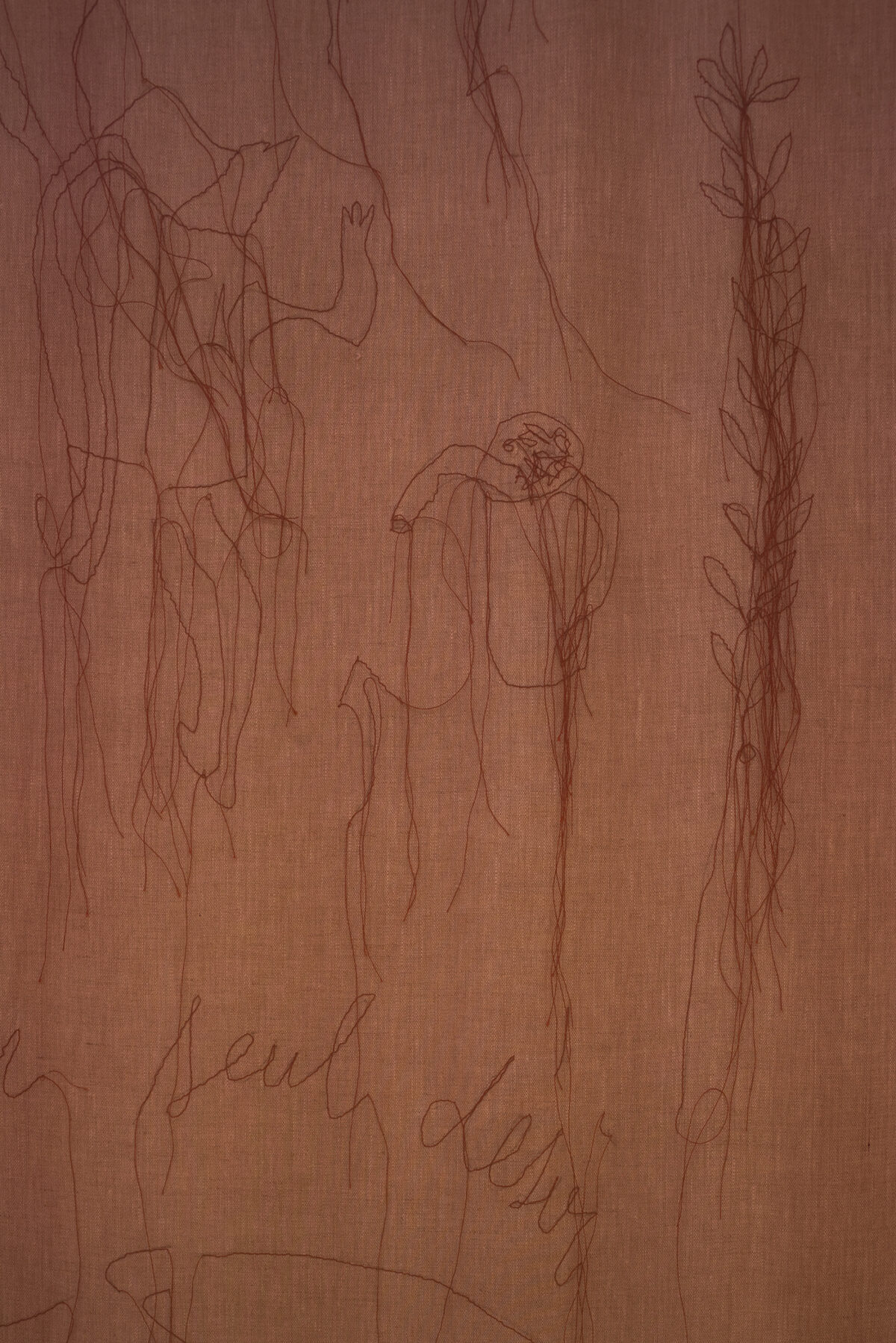 if drawing, conjuring figures and elements that create a score for a larger action, and also highly intimate scenes divested of any sense of linear narrative. One of them contains the inscription À mon seul désir (To my only desire), a quotation referring to The Lady and the Unicorn who silently dwell within the medieval tapestries Mercedes visited at the Musée de Cluny in Paris. The other textile has the word “Ruda” sewn on it, in reference to the plant which was believed to have protective and abortive powers and was used in magical rites since ancient times. The etymology of ruta is derived from the Latin rupta (a paved, cleared or ‘broken’ road).