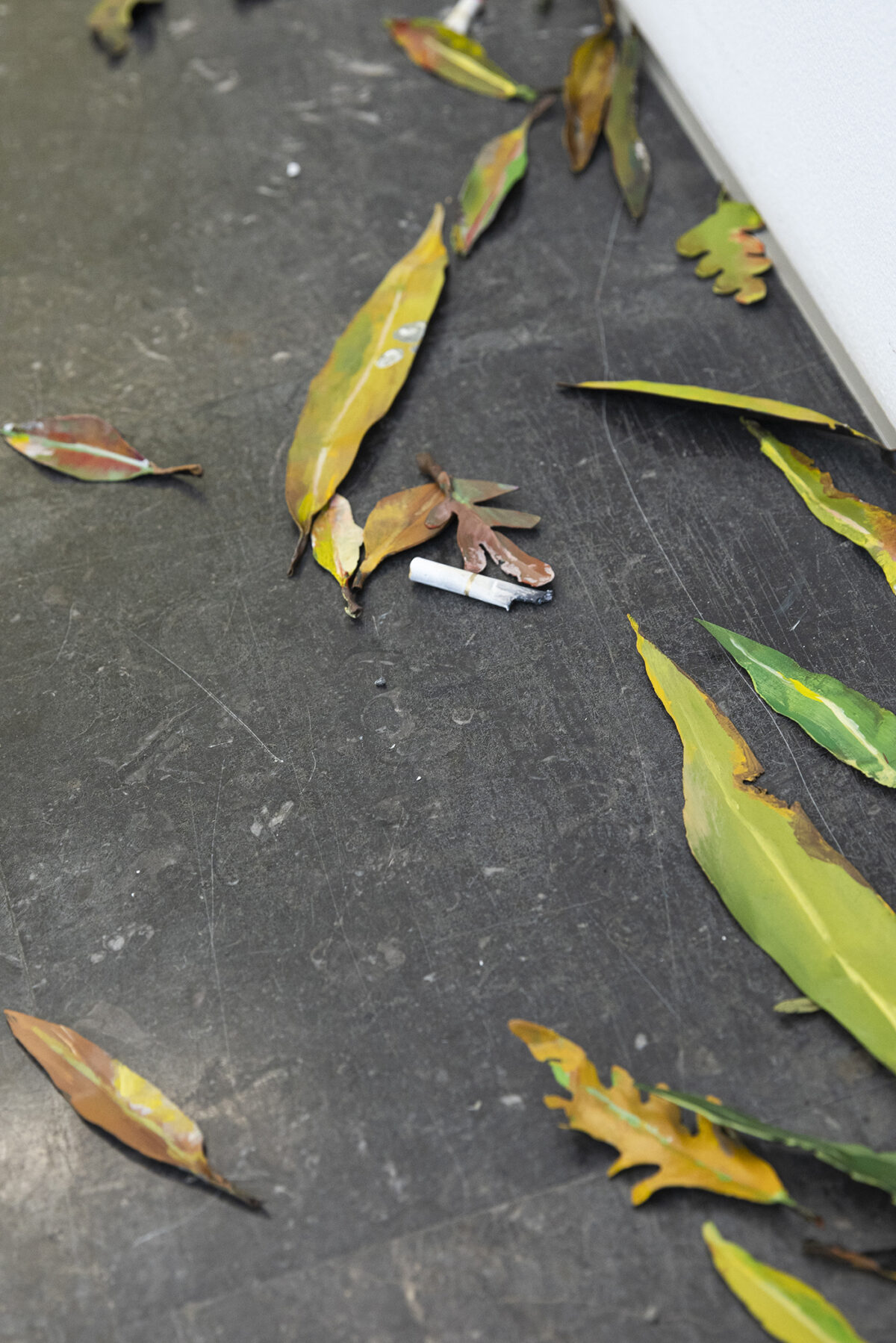We will search for crumbs of bread that might provide clues on how to starting reading these stories. A group of metal elements painted with meticulous detail emulates weeds and cigarette butts strewn on the floor in one of the corners at the entrance to the gallery. Álvaro Urbano creates installations that conceive a space and its inhabitants as possible co-authors of a narration. His usual point of departure is architecture, fiction, theatre and heterotopia (other, disturbing, contradictory spaces). In this case, he activates a mental, dreamlike and sentient landscape; an immersive experience in which the spectator must finish the story.