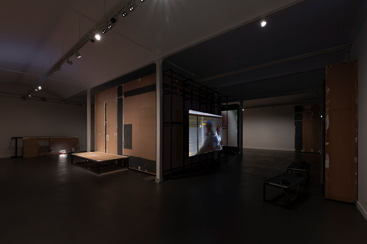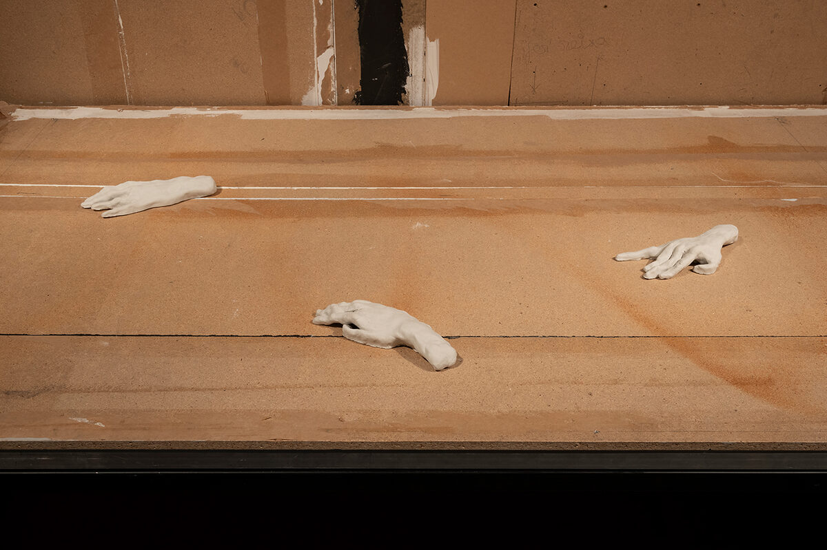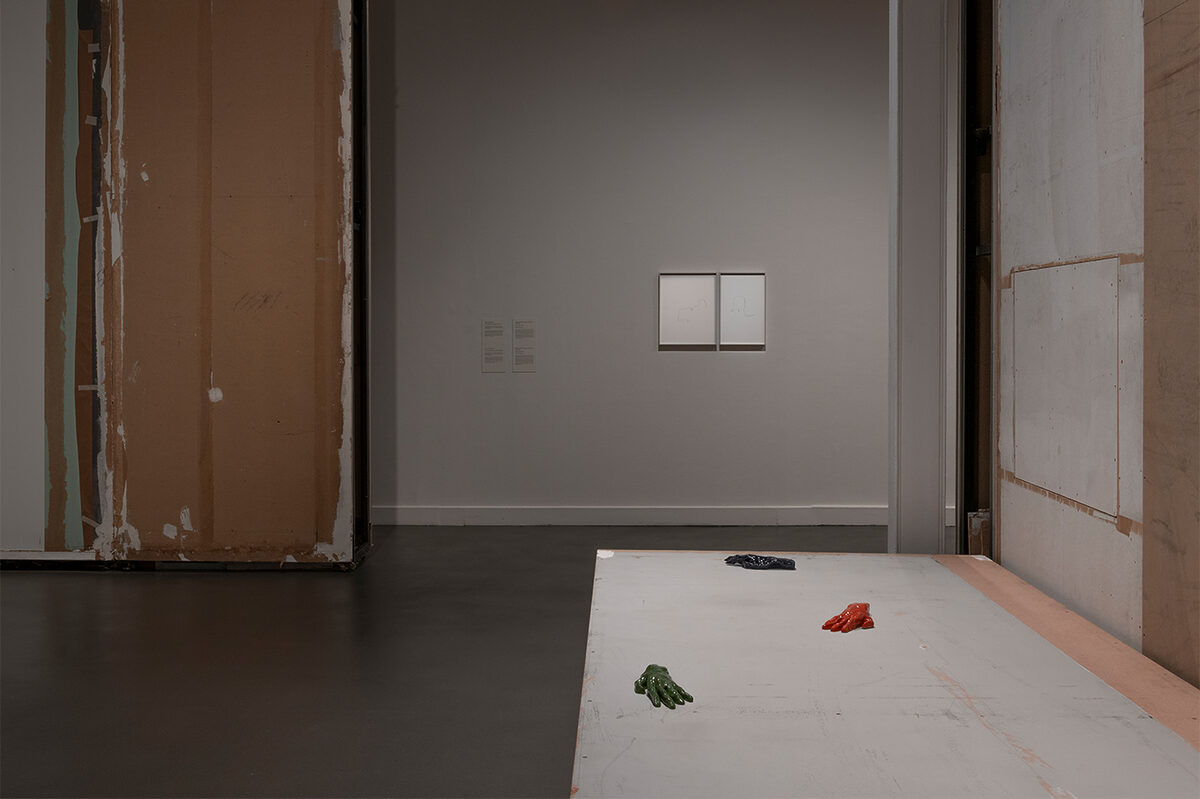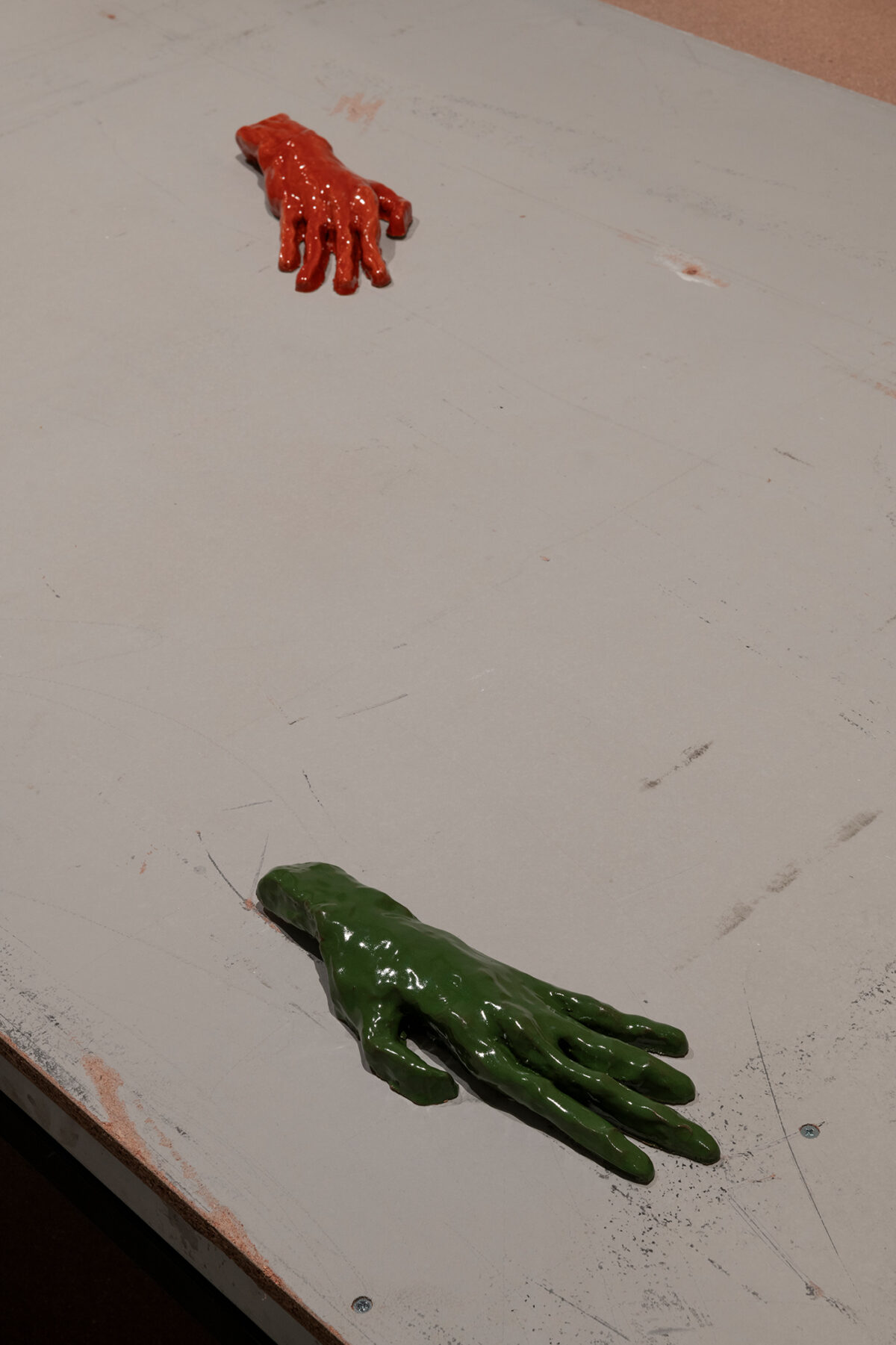 Diametrically opposed to this film, Reynolds presents a new short film that places the viewer in the uneasy position of an interviewee. Second Person, Third Person (2023) stems from an ongoing research on the centrality of narrative in the institutional bureaucracy surrounding asylum law. Based on the transcription of an interview held at the French Office for the Protection of Refugees and Stateless Persons, this film paints a disturbing picture of state apparatuses and offers a reflection on the enormous power of storytelling on the actual lives of its protagonists. The exhibition weaves together recent works in which Reynolds interrogates the idea of the portrait in order to go beyond the supremacy of the visual. A series of grotesque hands made of clay, modelled solely through touch, embody Theo, former flatmate of the artist. One hand portrays another, without resorting to the sense of vision. Likewise, a group of customised tuning forks dotted throughout the show capture the unique voice pitch of Justine, a friend of Reynolds’, making the exhibition’s bare construction materials and modular panels ring.