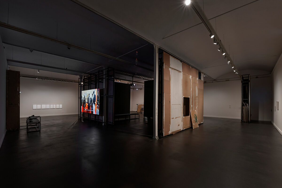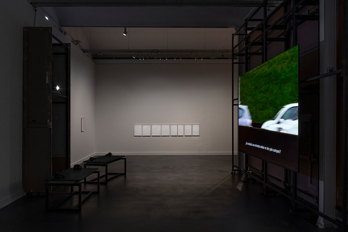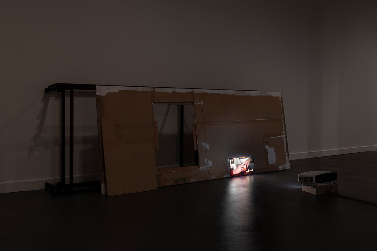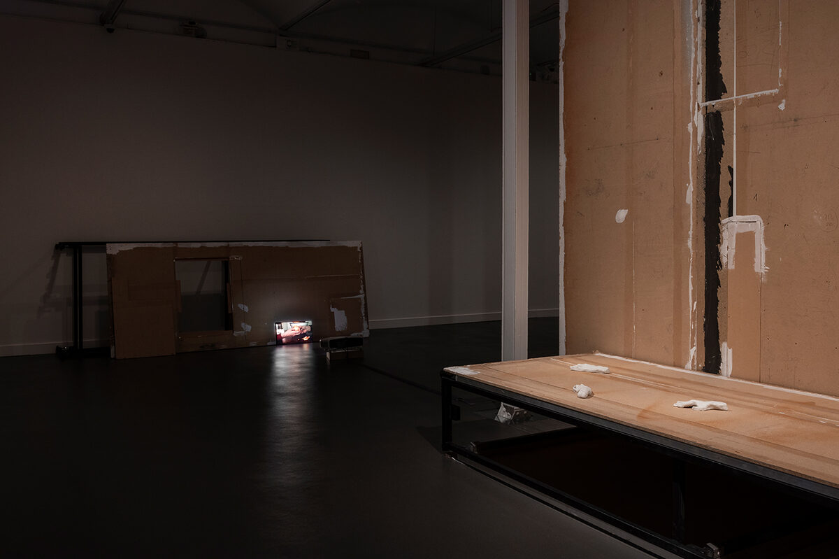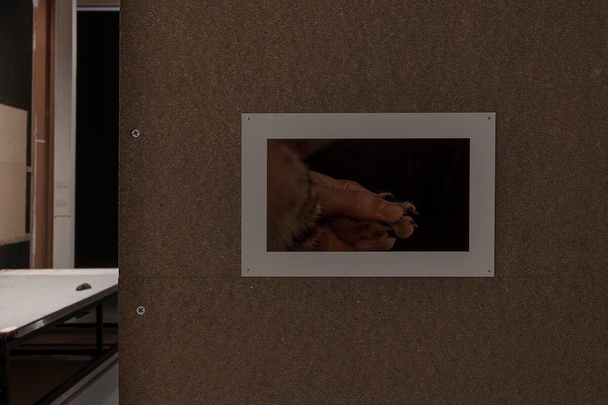 Diametrically opposed to this film, Reynolds presents a new short film that places the viewer in the uneasy position of an interviewee. Second Person, Third Person (2023) stems from an ongoing research on the centrality of narrative in the institutional bureaucracy surrounding asylum law. Based on the transcription of an interview held at the French Office for the Protection of Refugees and Stateless Persons, this film paints a disturbing picture of state apparatuses and offers a reflection on the enormous power of storytelling on the actual lives of its protagonists. The exhibition weaves together recent works in which Reynolds interrogates the idea of the portrait in order to go beyond the supremacy of the visual. A series of grotesque hands made of clay, modelled solely through touch, embody Theo, former flatmate of the artist. One hand portrays another, without resorting to the sense of vision. Likewise, a group of customised tuning forks dotted throughout the show capture the unique voice pitch of Justine, a friend of Reynolds’, making the exhibition’s bare construction materials and modular panels ring.