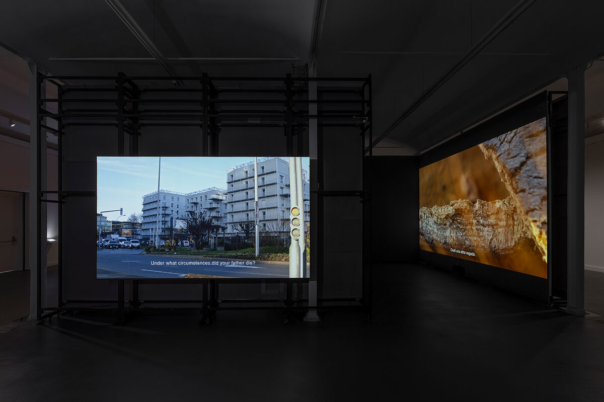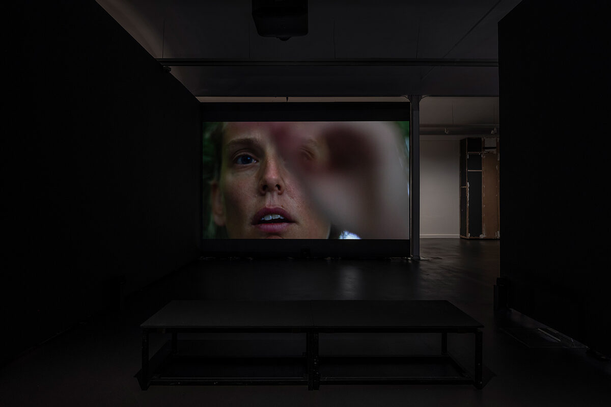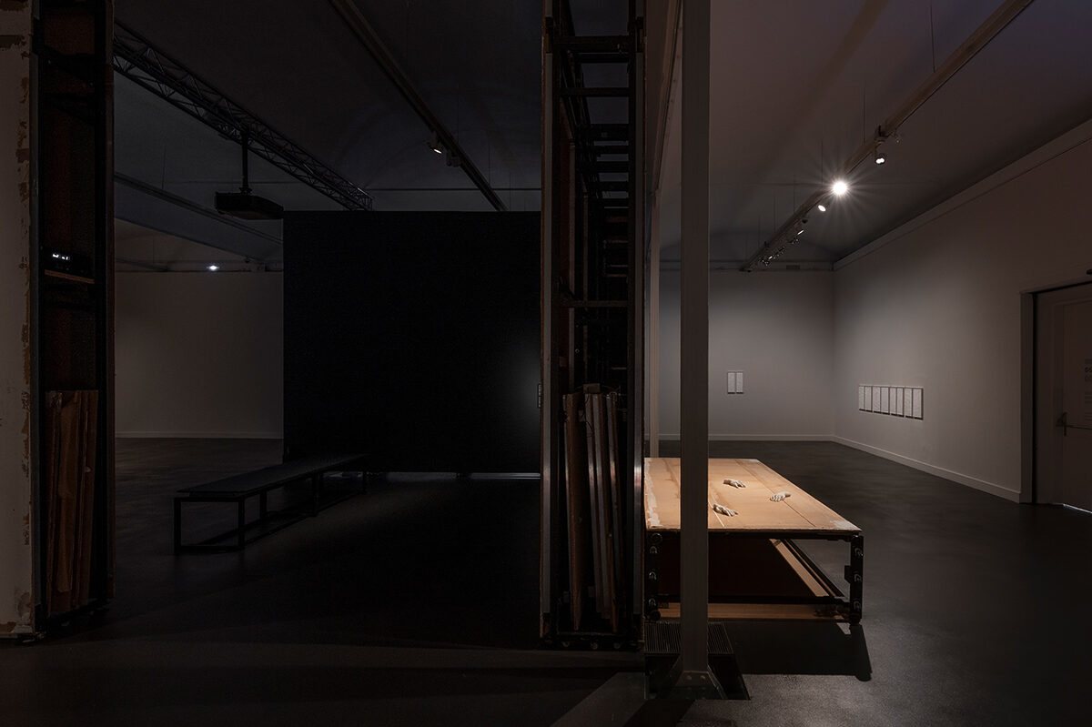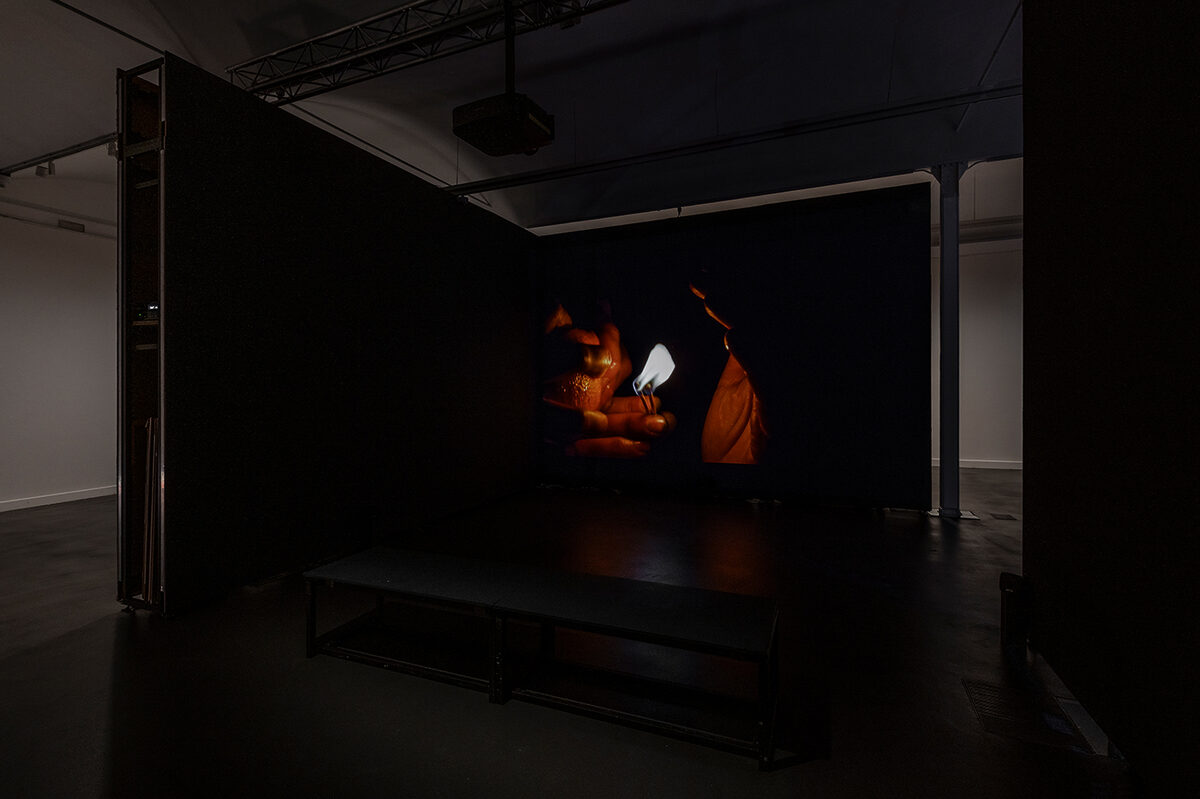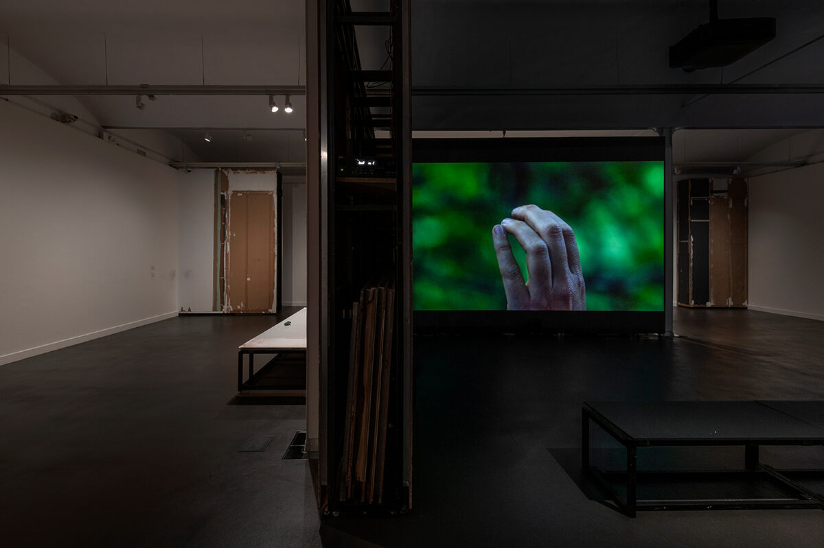 Radiating from the centre of the exhibition, The Hand that Sings (2021) weaves a complex ecology of gestures, sounds and images in which the movements of Swedish choreographer Alma Söderberg and of the actual camera – acting also as performer – resonate with the fluttering wings of a bird or the echoes of an axe on the bark of a cork oak. Multiple viewpoints and sensorial levels overlap in this hallucinatory footage to suggest a complete reorganisation of the senses.
