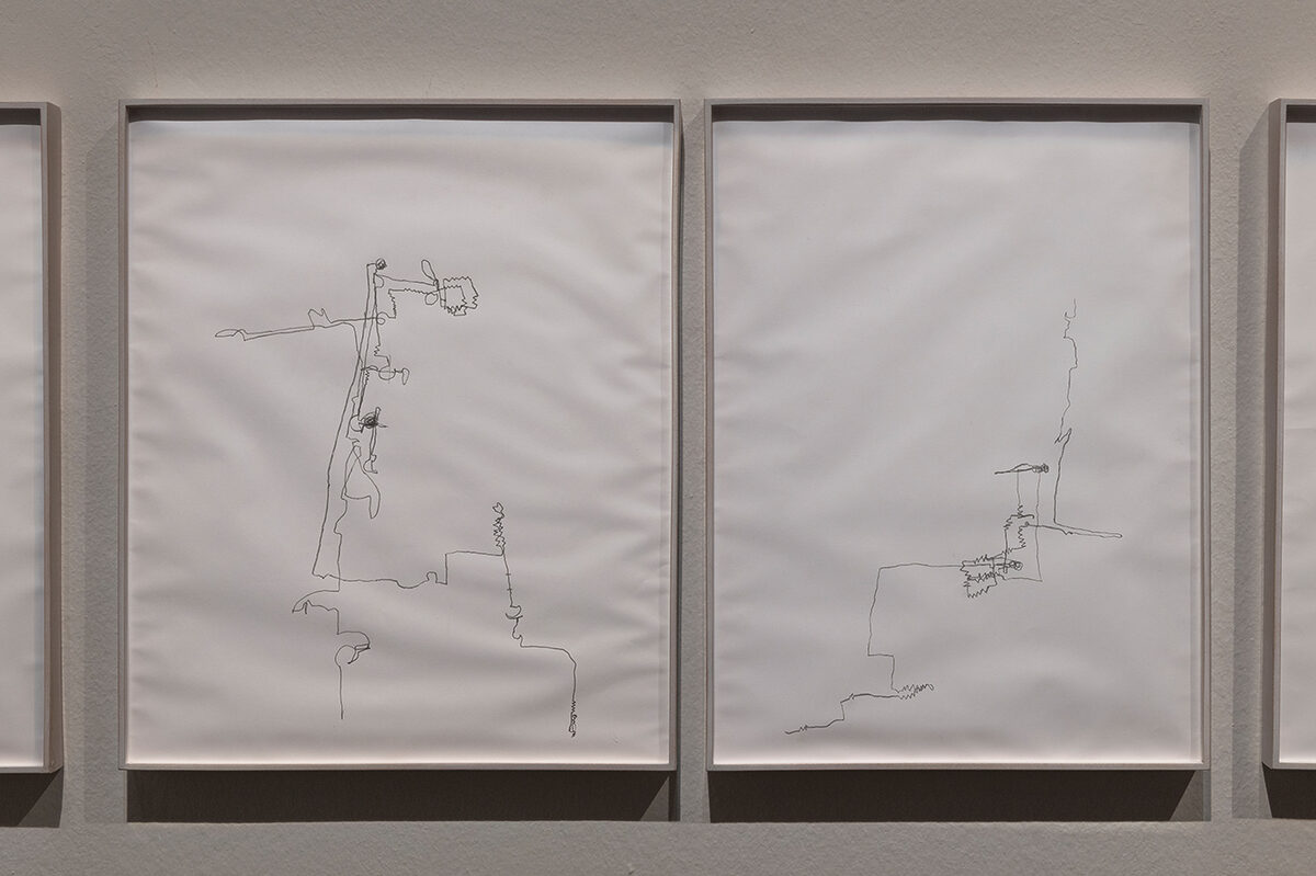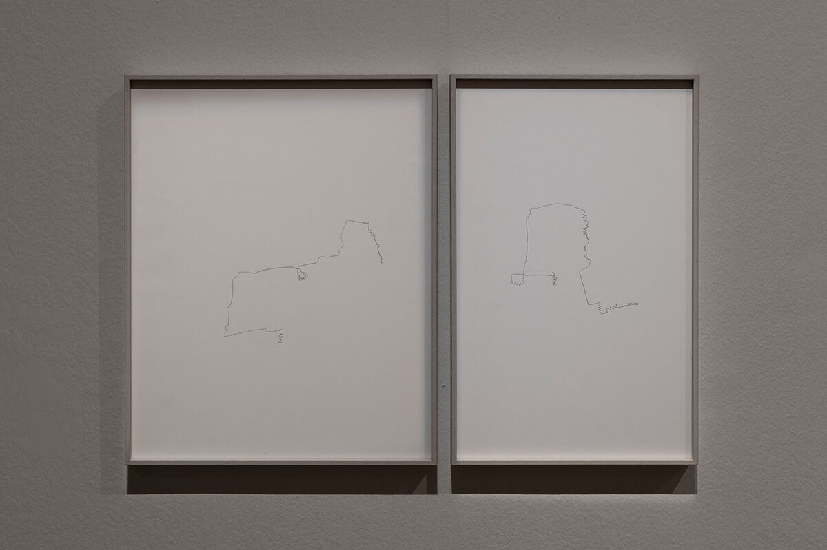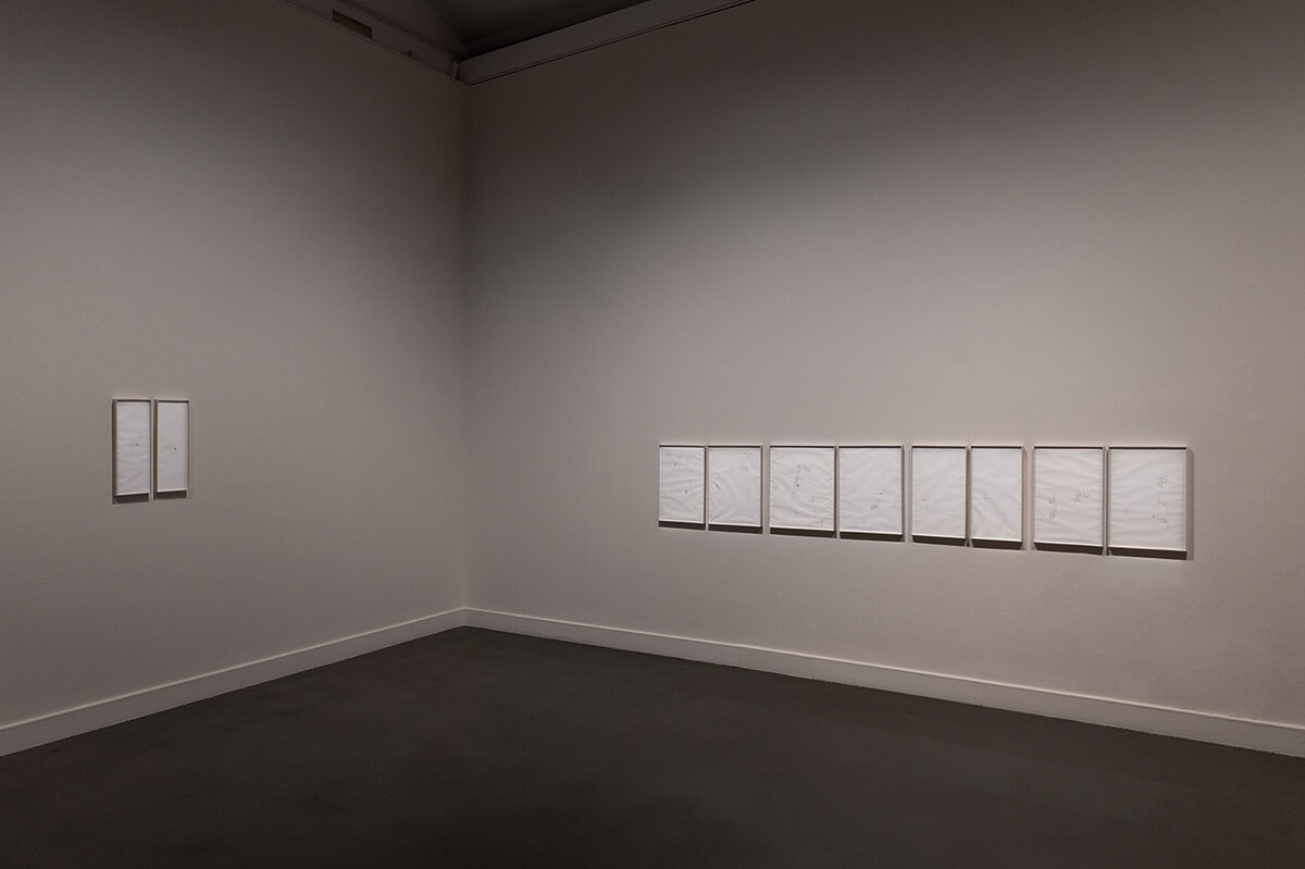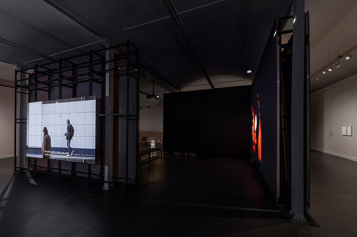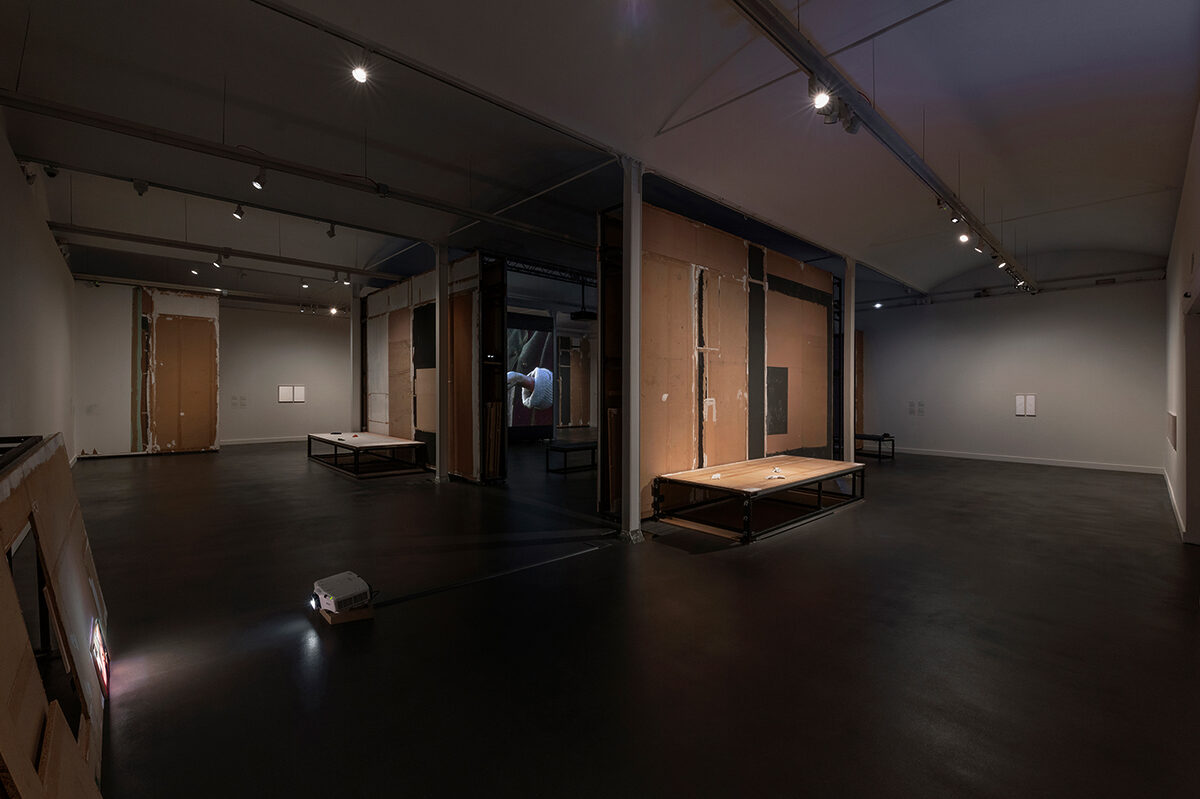 Radiating from the centre of the exhibition, The Hand that Sings (2021) weaves a complex ecology of gestures, sounds and images in which the movements of Swedish choreographer Alma Söderberg and of the actual camera – acting also as performer – resonate with the fluttering wings of a bird or the echoes of an axe on the bark of a cork oak. Multiple viewpoints and sensorial levels overlap in this hallucinatory footage to suggest a complete reorganisation of the senses.